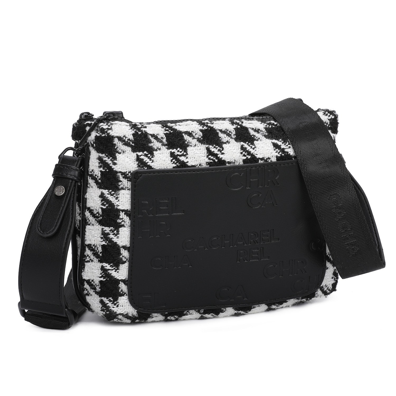 Bandolera pata de gallo con bolsillo personalizado, dos bolsillos principales y un bolsillo trasero con asa ajustable personalizada.
