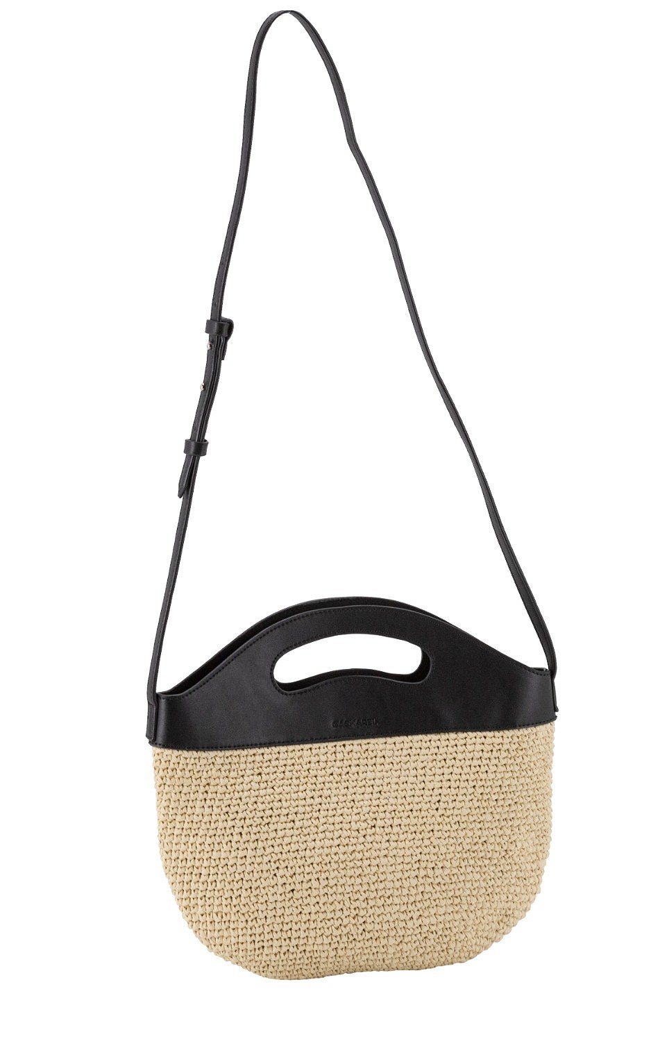 - Bandolera fabricada en piel sintética y rafia
