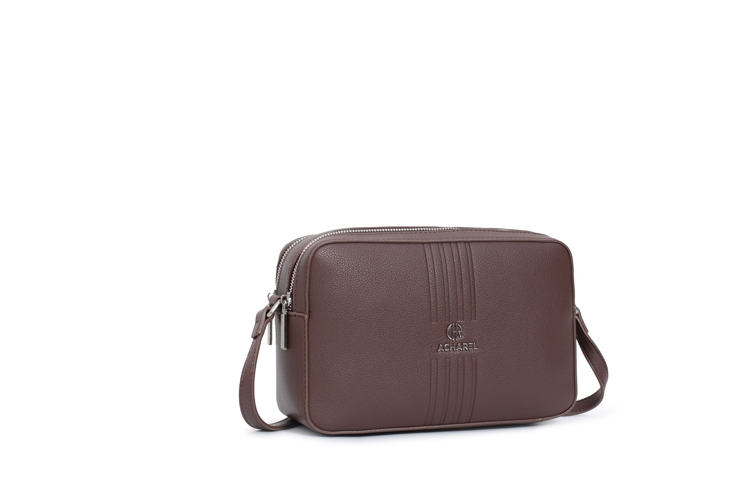Bandolera de tamaño mediana de color castaño con doble compartimento. Práctica y moderna, ideal para dar un toque chic a cualquier estilismo diario. Cierre en cremallera, tiradores personalizados y varios bolsillos en el interior.