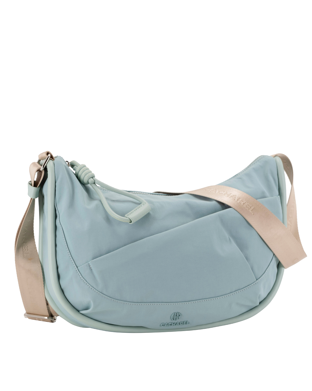 Bolso bandolera de tamaño mediano fabricado en nylon ultra ligero para dar más comodidad al día a día. Combinado con asa regulable en beig. Tiradores personalizados y varios bolsillos en el interior.