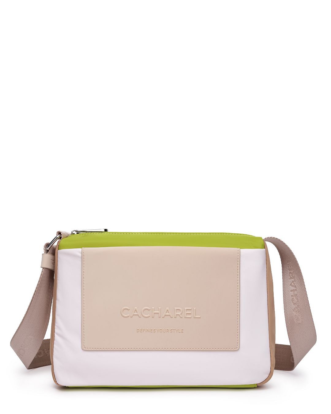 Es un bolso de diseño moderno y funcional, confeccionado en nylon, lo que lo hace muy ligero y cómodo para el uso diario. Presenta un atractivo diseño en bloques de color con tonos suaves y actuales, que le dan un aire fresco y urbano.
