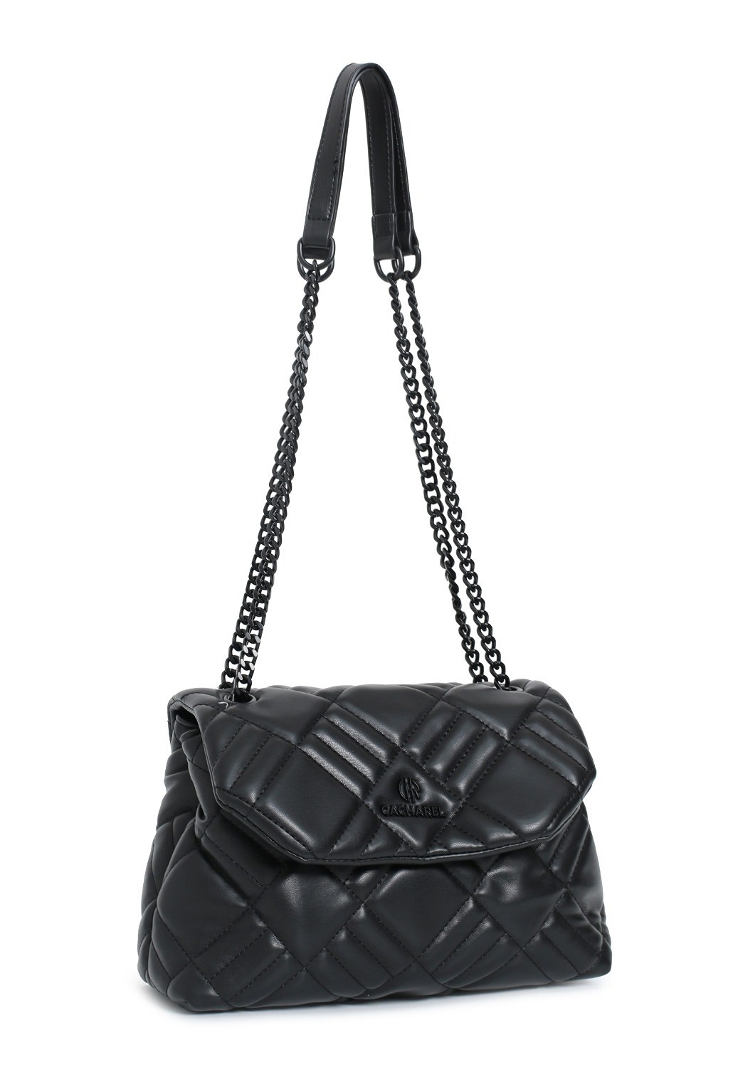 Bolso con novedoso alcolchado con asa de hombro combinada con cadena. Doble compartimento, cierre con cremallera. Logo metálico en la parte delantera del bolso. Tiradores personalizados y varios bolsillos interiores.