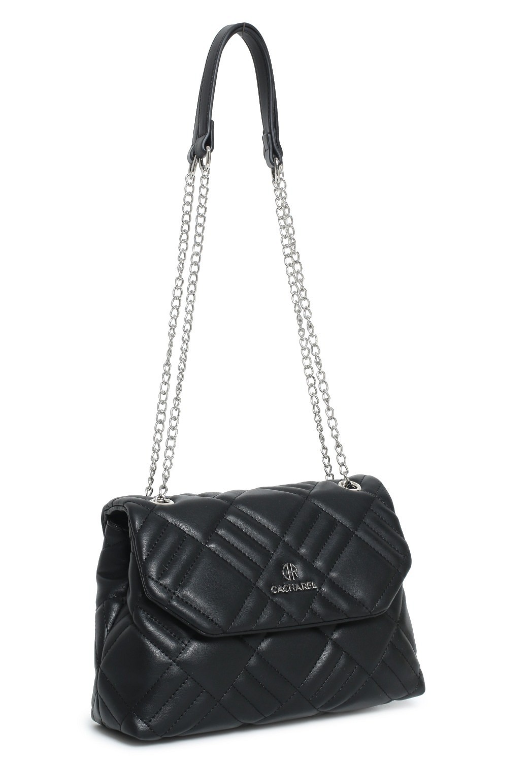 Bolso con novedoso alcolchado con asa de hombro combinada con cadena. Doble compartimento, cierre con cremallera. Logo metálico en la parte delantera del bolso. Tiradores personalizados y varios bolsillos interiores.
