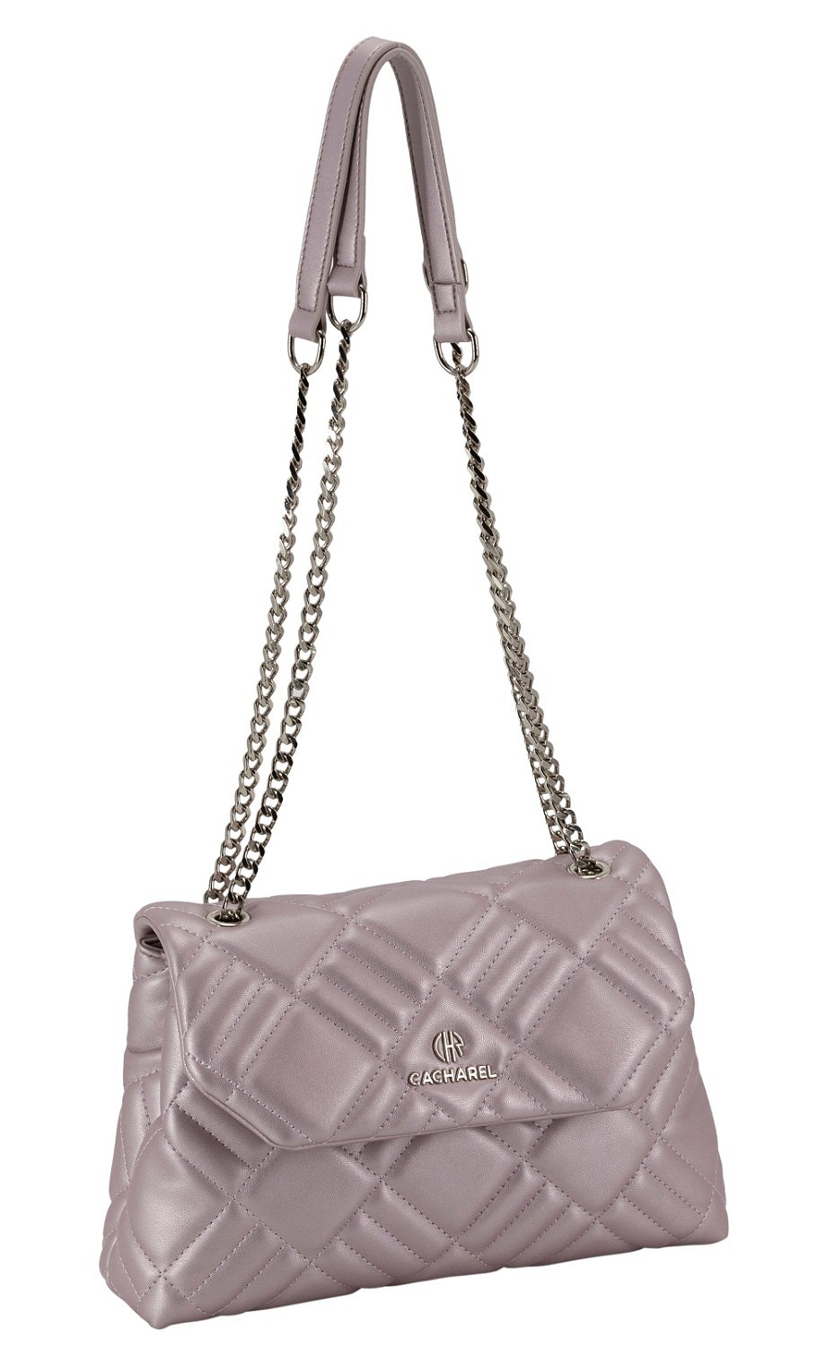 Bolso con novedoso alcolchado con asa de hombro combinada con cadena. Doble compartimento, cierre con cremallera. Logo metálico en la parte delantera del bolso. Tiradores personalizados y varios bolsillos interiores.
