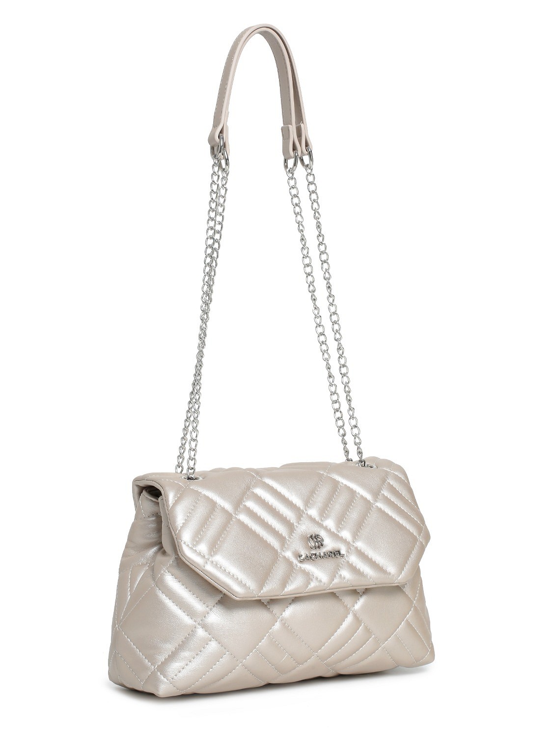 Bolso con novedoso alcolchado con asa de hombro combinada con cadena. Doble compartimento, cierre con cremallera. Logo metálico en la parte delantera del bolso. Tiradores personalizados y varios bolsillos interiores.