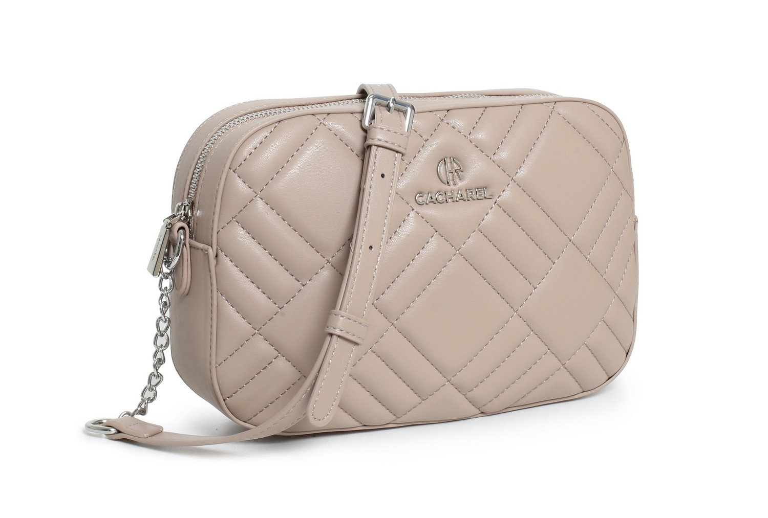 Bolso bandolera con novedoso acolchado en color beige combinado con asa bandolera de cadena y tira regulable con hebilla. Cierre con cremallera. Logo metálico en la parte delantera del bolso. Tiradores personalizados y varios bolsillos interiores.
