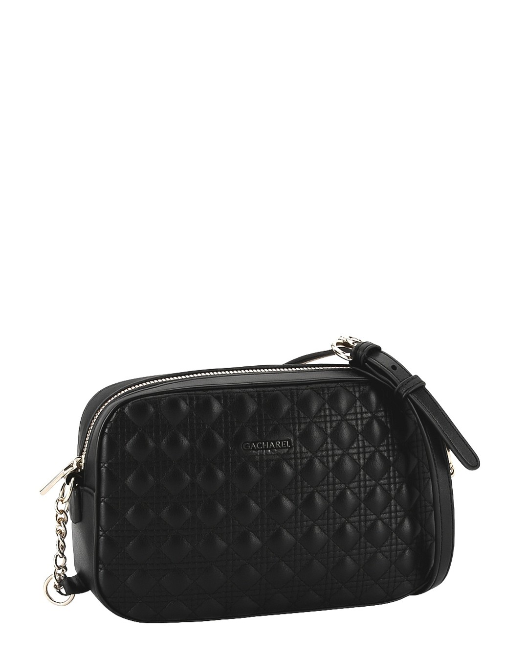 Bolso bandolera con novedoso acolchado en color negro combinado con asa bandolera de cadena y tira regulable con hebilla. Cierre con cremallera. Logo metálico en la parte delantera del bolso. Tiradores personalizados y varios bolsillos interiores.