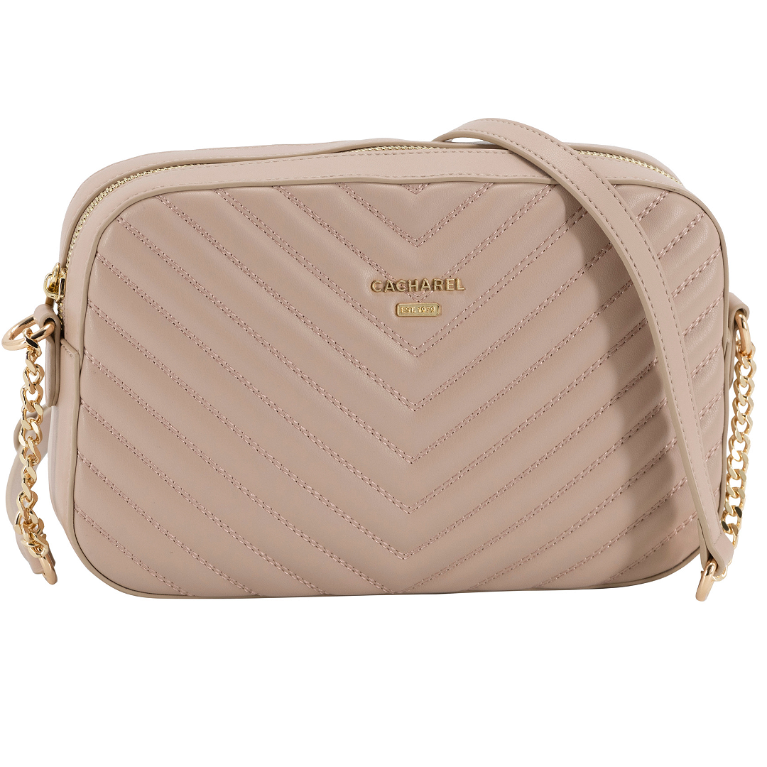 Bolso bandolera con novedoso acolchado en espiga combinado con asa bandolera de cadena y tira regulable con hebilla. Cierre con cremallera. Logo metálico en la parte delantera del bolso. Tiradores personalizados y varios bolsillos interiores.