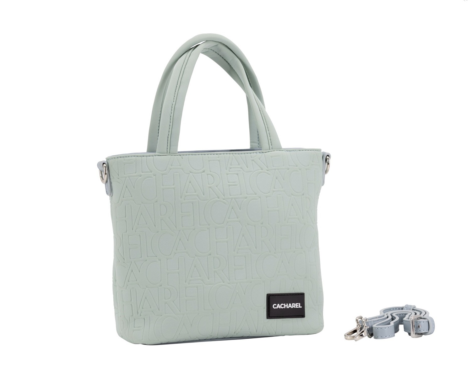 Bolso bandolera elaborado con material novedoso con estampado CACHAREL combiando con piel sintética. Apliques en tono niquel. Cierre con cremallera.