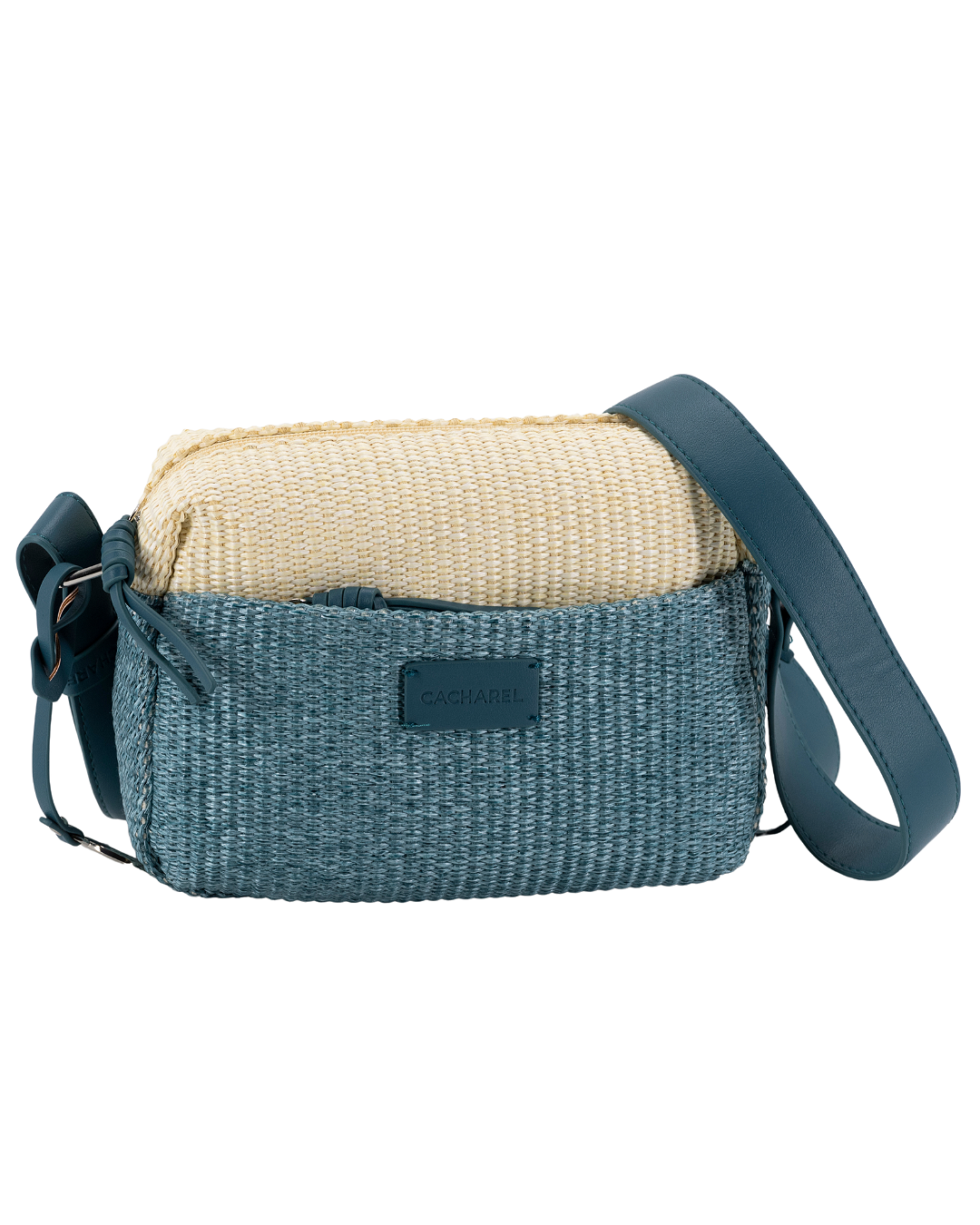 Bolso bandolera elaborado con materiales novedosos en tonalidades beig y aqua. Cierre en cremallera, bolsillo en la parte delantera y trasera.