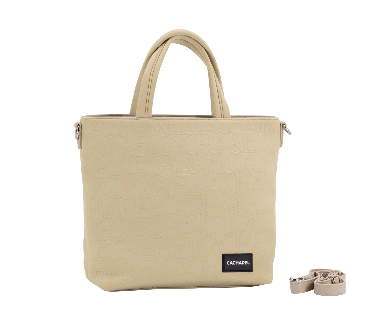 Bolso bandolera elaborado con material novedoso con estampado CACHAREL combiando con piel sintética. Apliques en tono niquel. Cierre con cremallera.