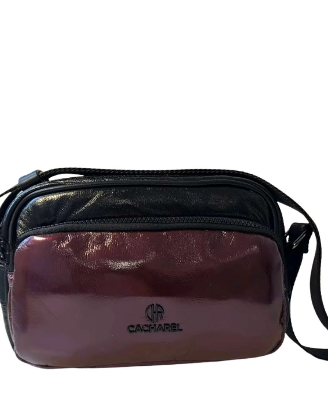Bolso bandolera con dos compartimentos principales, bolsillo delantero y logo metálico en la parte delantera del bolso. Asa regualable personalizada con el logo de Cacharel. Varios bolsillos interiores.
