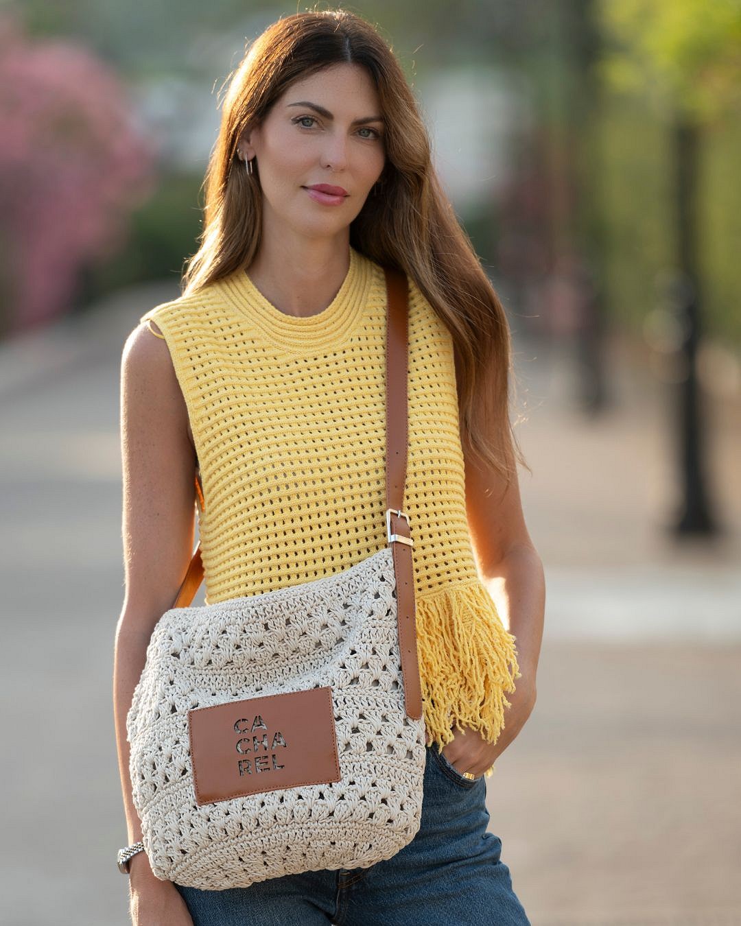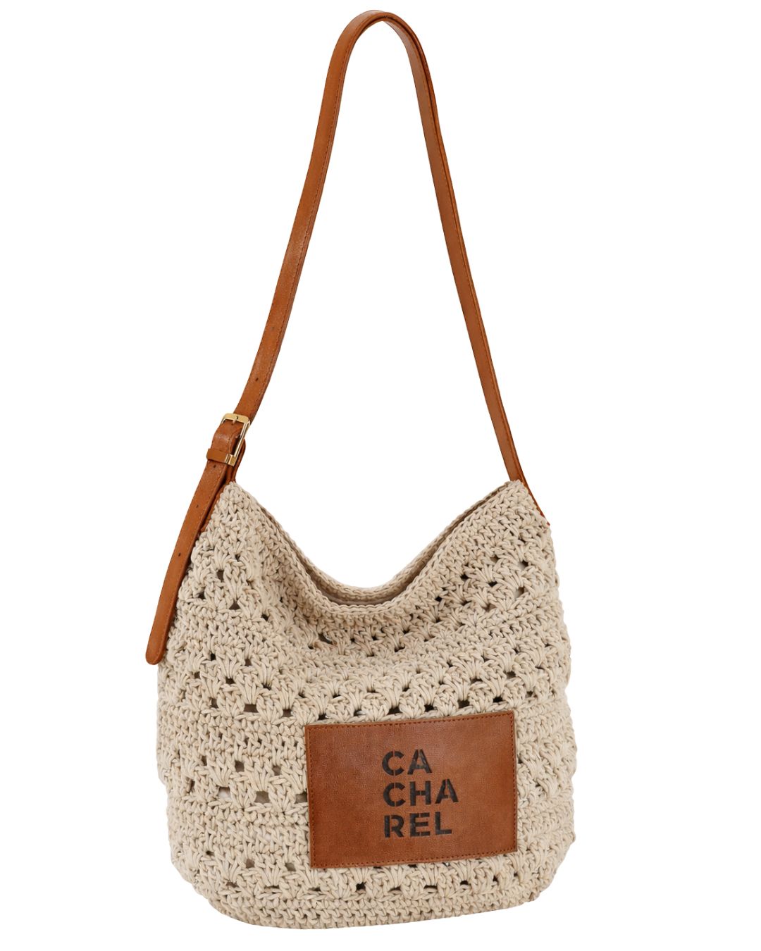 Cuenta con una asa larga ajustable en acabado efecto piel, pensada para llevarlo cómodamente al hombro o cruzado. En el frontal incorpora un parche con el logotipo CACHAREL, que añade un toque distintivo y elegante al diseño artesanal.