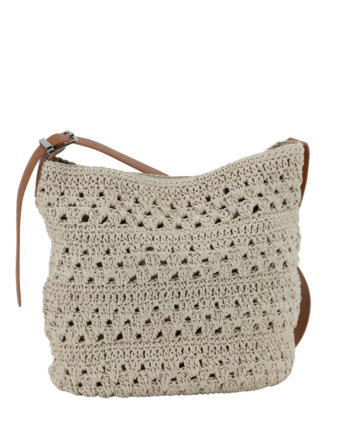 Este bolso de hombro destaca por su estilo artesanal y natural, confeccionado en ganchillo con un delicado entramado que aporta textura y ligereza, ideal para los meses de primavera y verano. Su tono beige neutro lo convierte en un complemento fácil de combinar con looks casuales y bohemios.