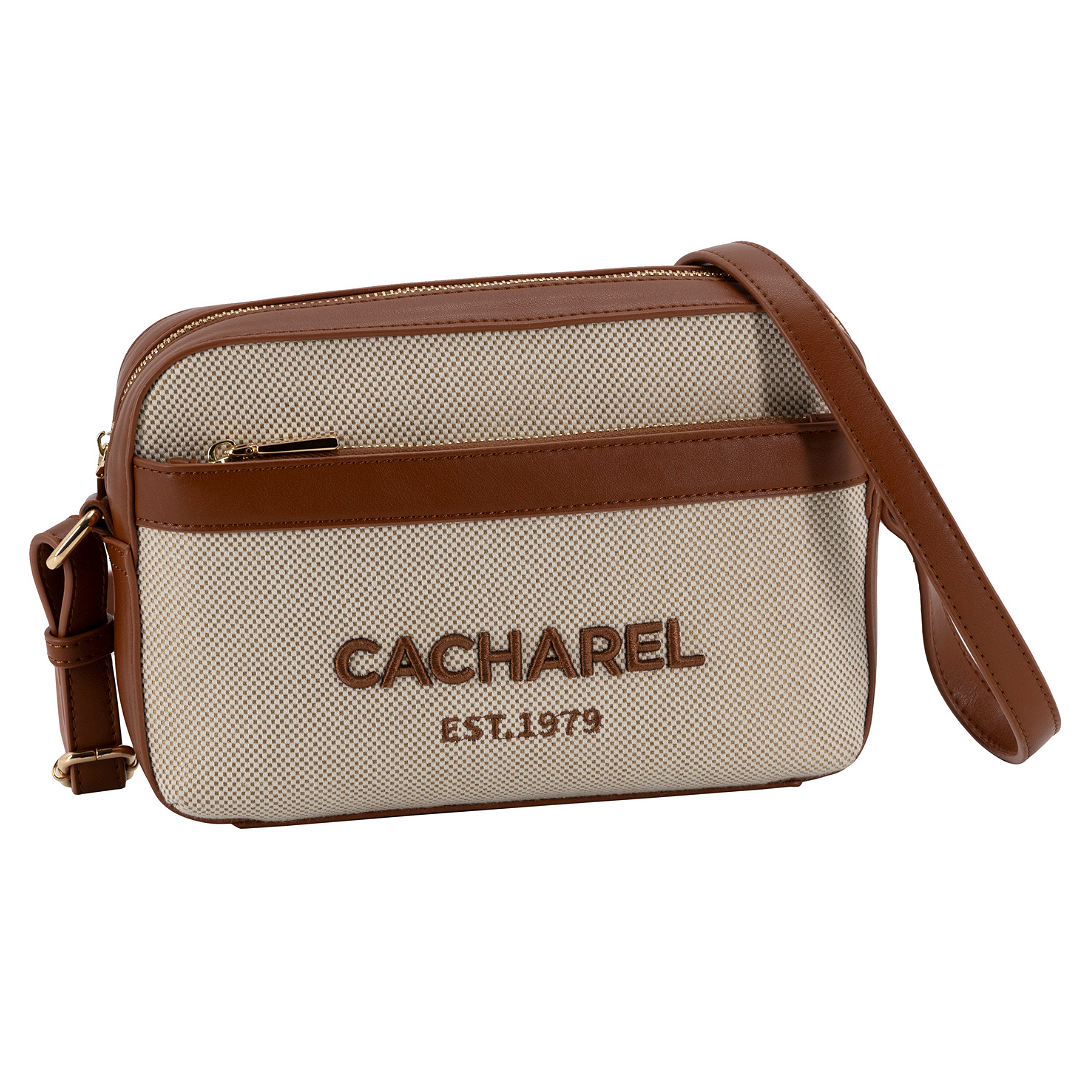 Bolso bandolera elaborado en lona de algodón y material vegano con nuestro logo CACHAREL bordado en la parte delantera. Asa regulable.