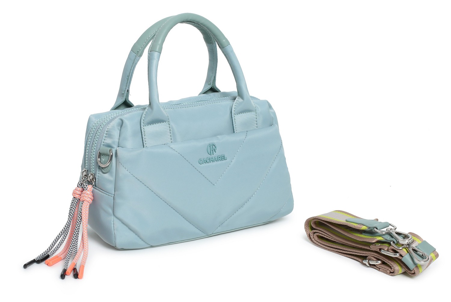 Bolso bandolera con dos compartimentos principales y un bolsillo delantero y otro trasero. Cuenta con dos asas de mano y asa corredera para llevarlo cruzado. Diseño acolchado, exterior personalizado con logo al tono y tirador de colores.