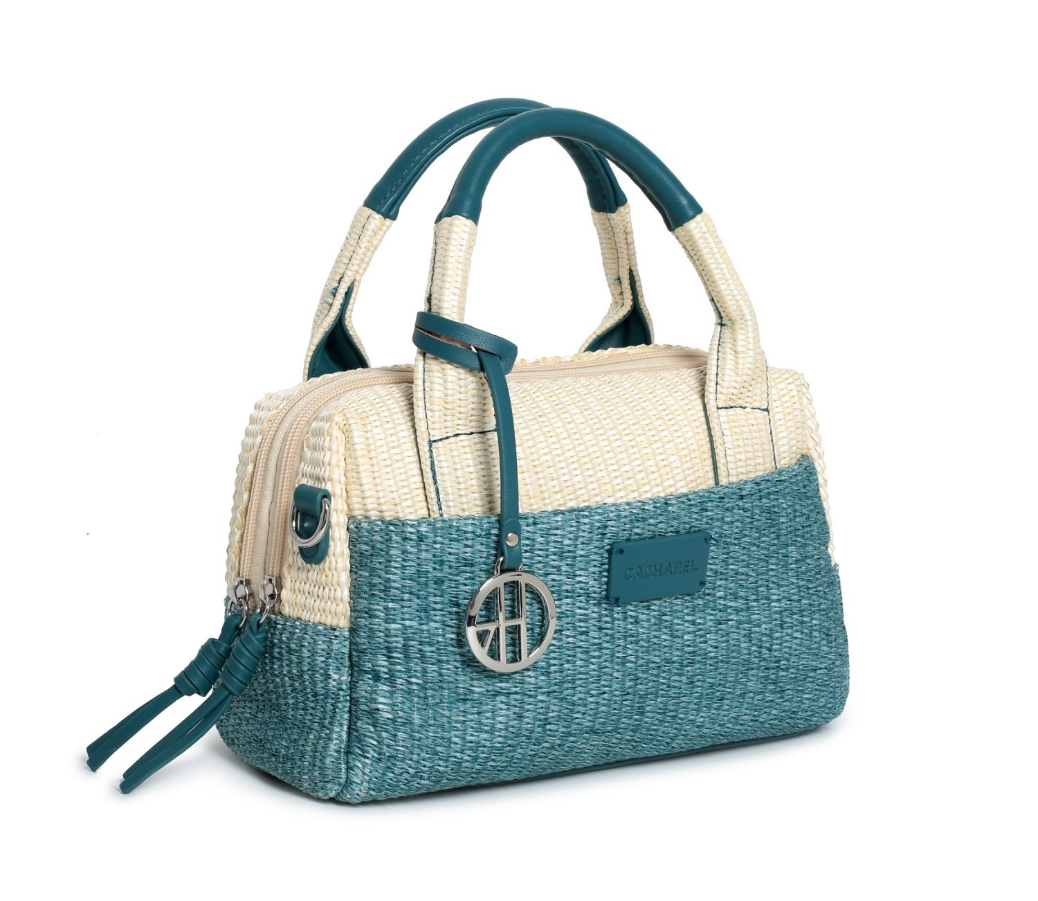 Bolso bandolera con dos compartimentos principales y un bolsillo delantero y otro trasero. Cuenta con dos asas de mano y asa corredera para llevarlo cruzado. Elaborado con materiales novedosos en tonalidades beig.