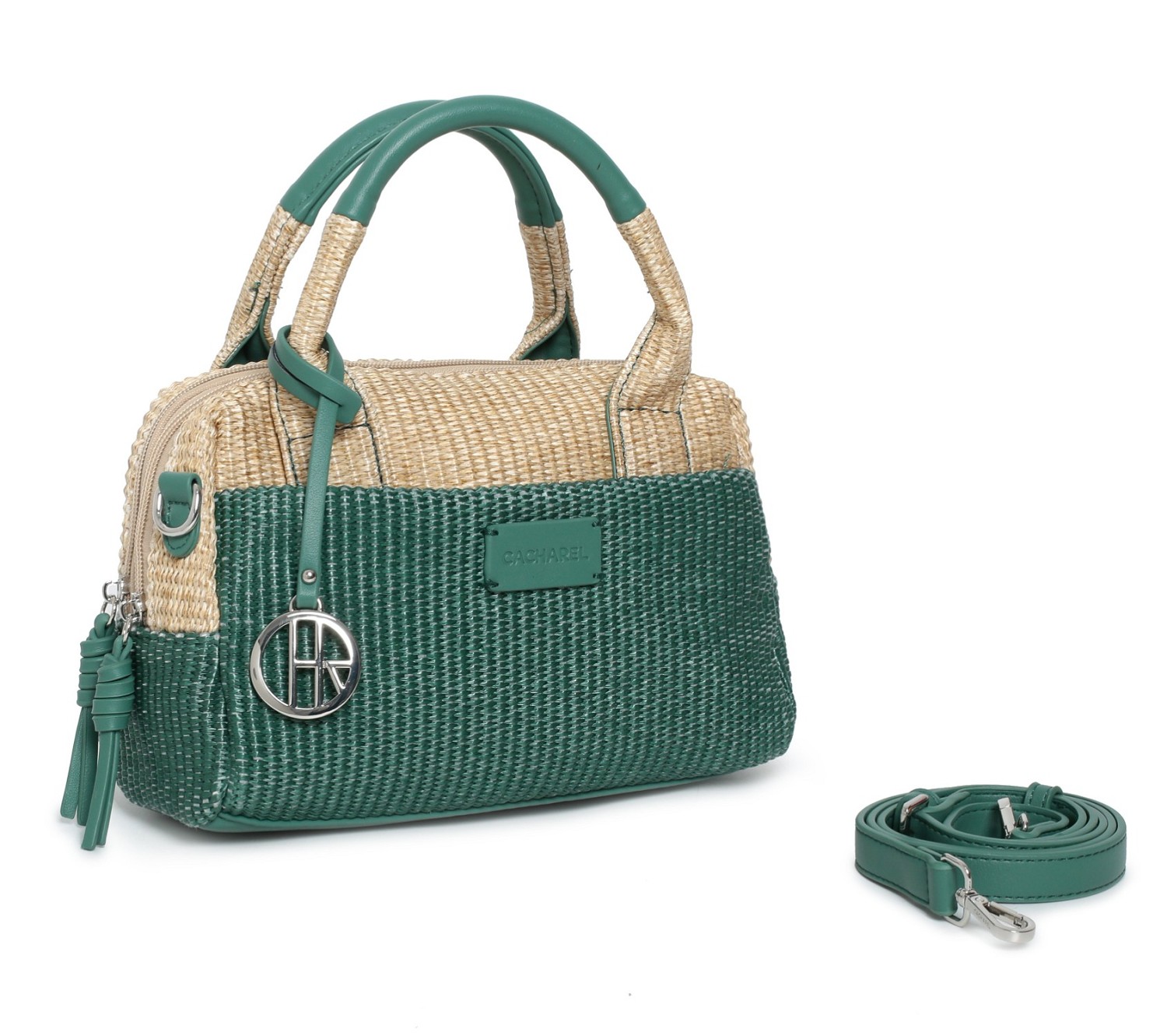 Bolso bandolera con dos compartimentos principales y un bolsillo delantero y otro trasero. Cuenta con dos asas de mano y asa corredera para llevarlo cruzado. Elaborado con materiales novedosos en tonalidades beig y aqua.