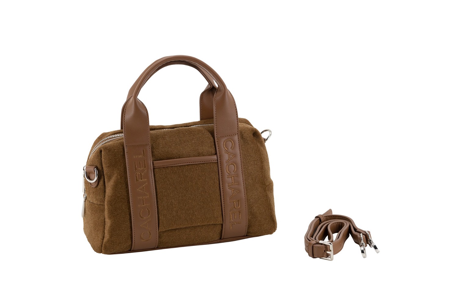 Bolso bandolera de tamaño mediano fabricado en fieltro con logotipo CACHAREL bordado en ambas asas, combinado con material sintético al tono. Doble apertura con cierre en cremallera, tiradores personalizados y varios bolsillos en el interior. Asa bandolera.