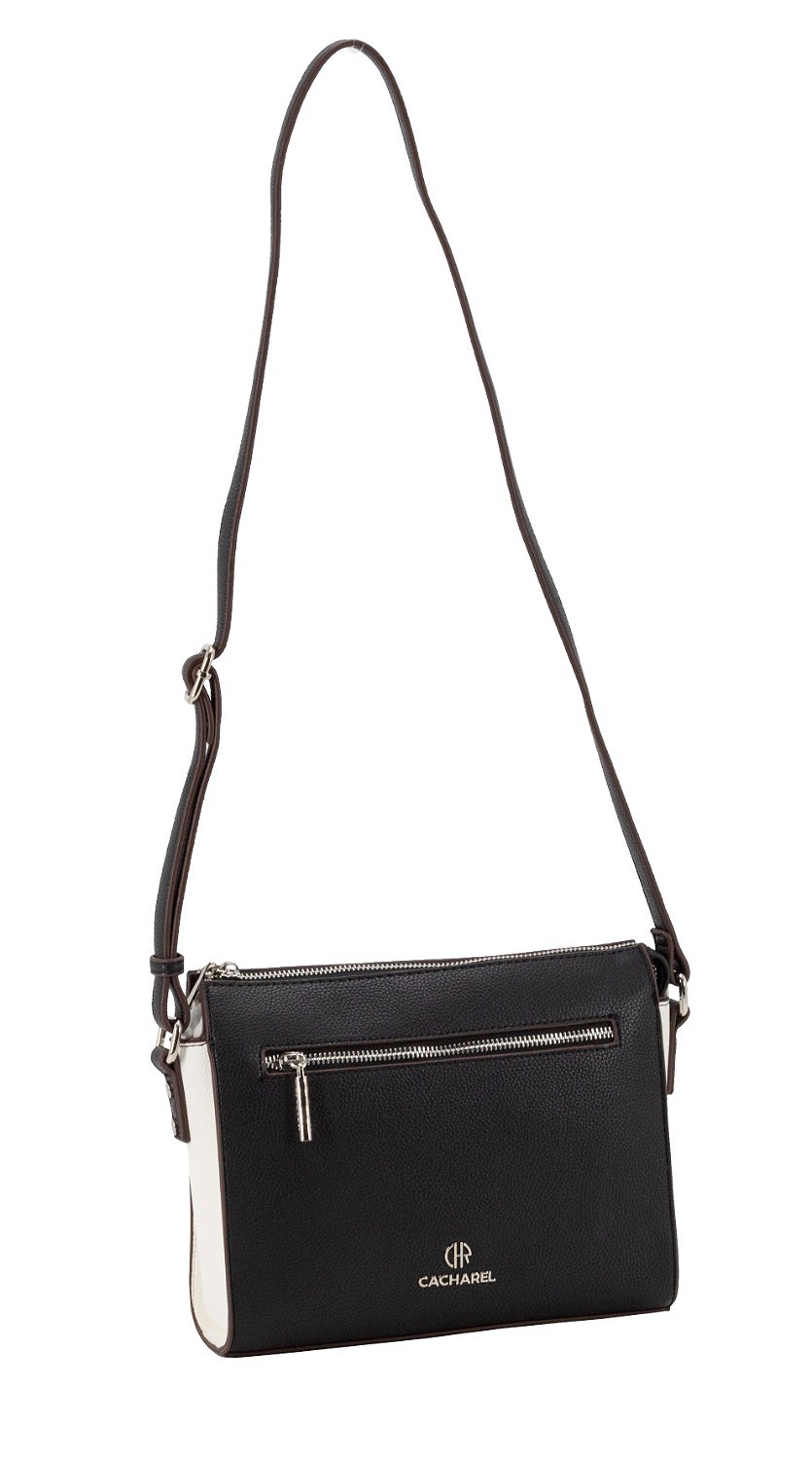 Bolso bandolera Lyon confeccionado en piel sintética con estampado efecto curtido, combinado en negro y blanco. Bolsillo exterior en ambas partes, tiradores personalizados y varios bolsillos en el interior.
