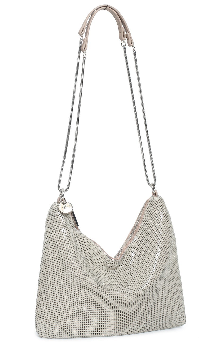 Bolso bandolera con novedoso material en color beig combinado con asa de cadena redonda. Cierre con cremallera. Medalla metálica en la parte delantera del bolso. Tiradores personalizados y varios bolsillos interiores.