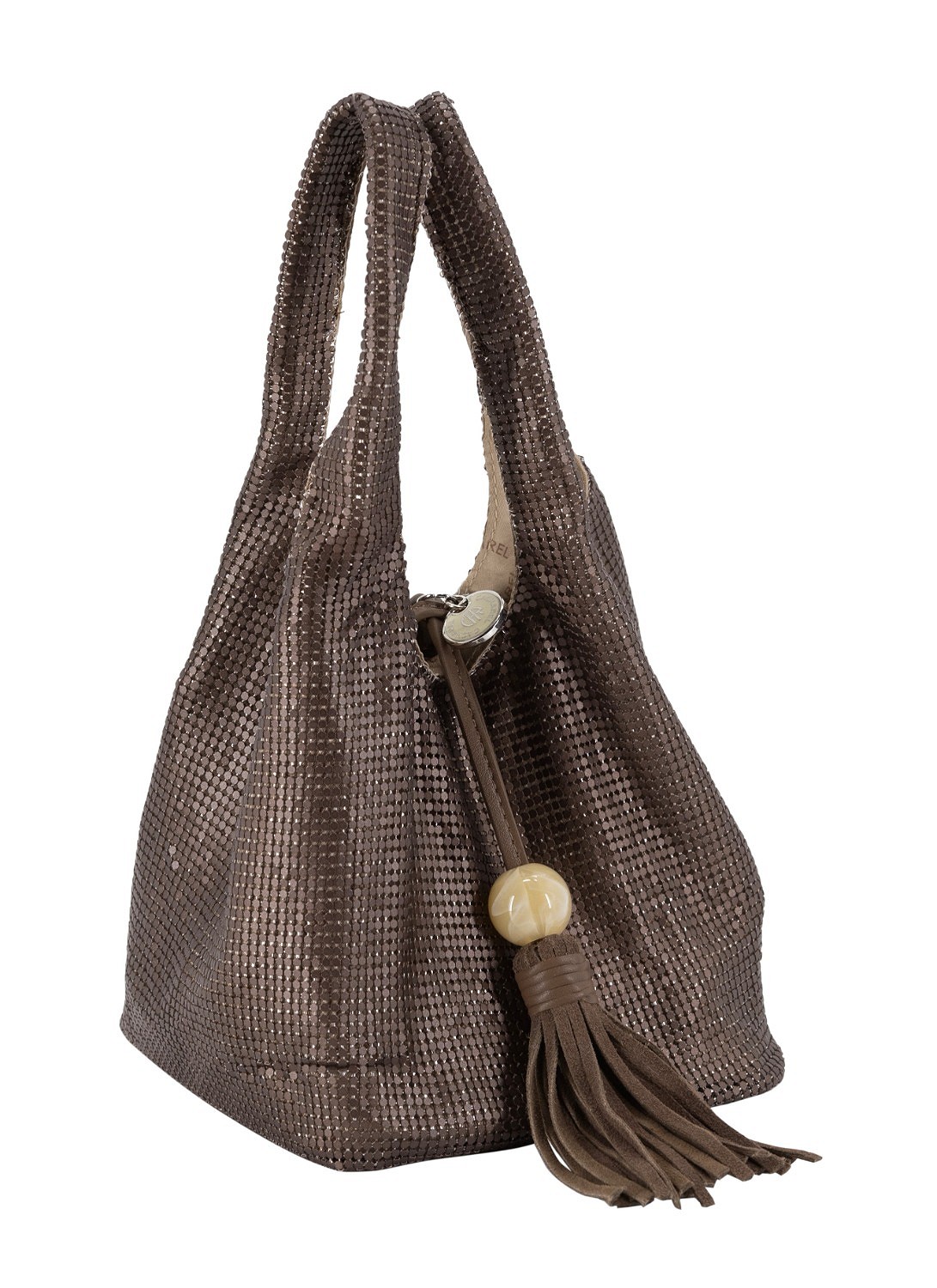 Bolso con novedoso material en color bronce combinado con un fantástico diseño de cierre y medalla cacharel metálica en la parte delantera del bolso.
