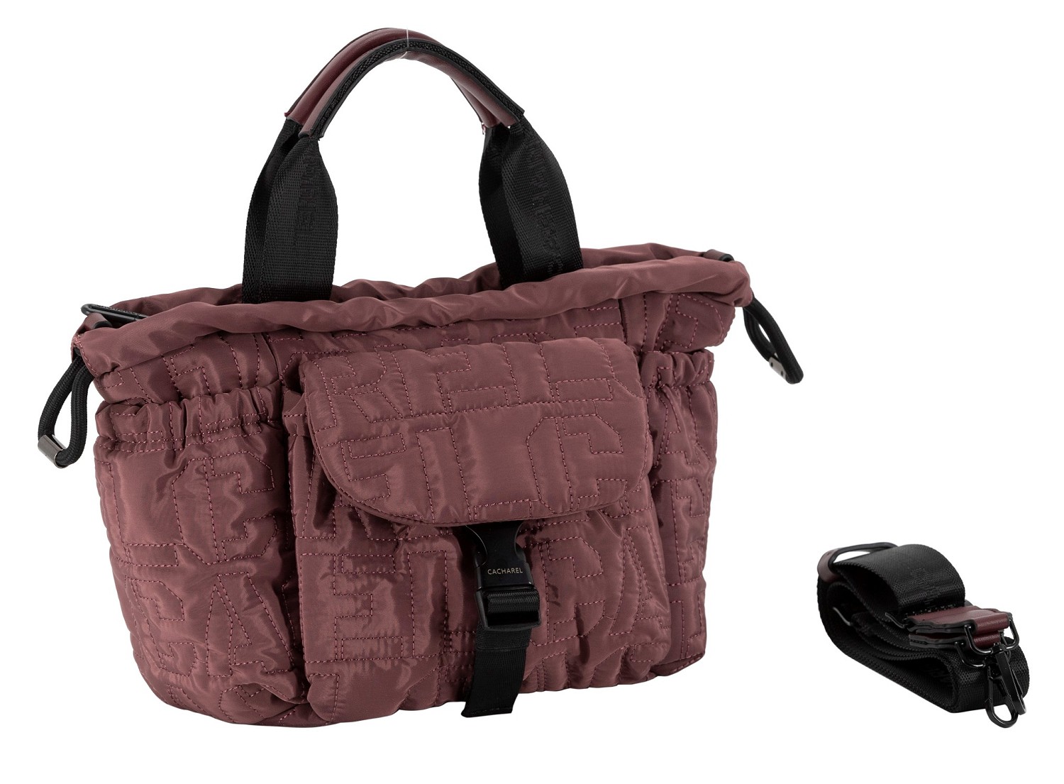 Bolso de mano y bandolera con bordado Cacharel confeccionada con nylon en color plum. Bolsillo delantero con solapa y cierre fácil, dos bolsillos laterales y uno trasero. Espacioso y con diseño. Cierre con cremallera. Tiradores personalizados y varios bolsillos interiores.