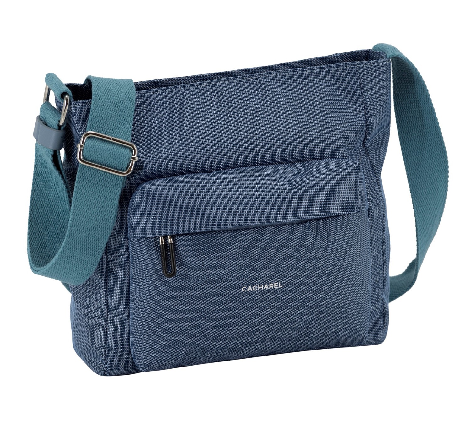 Bolso bandolera de tamaño mediano-grande cierre con cremallera, asa bandolera ajustable y bolsillo exterior. Exterior personalizado con logo en goma al tono y tirador en color negro personalizado.