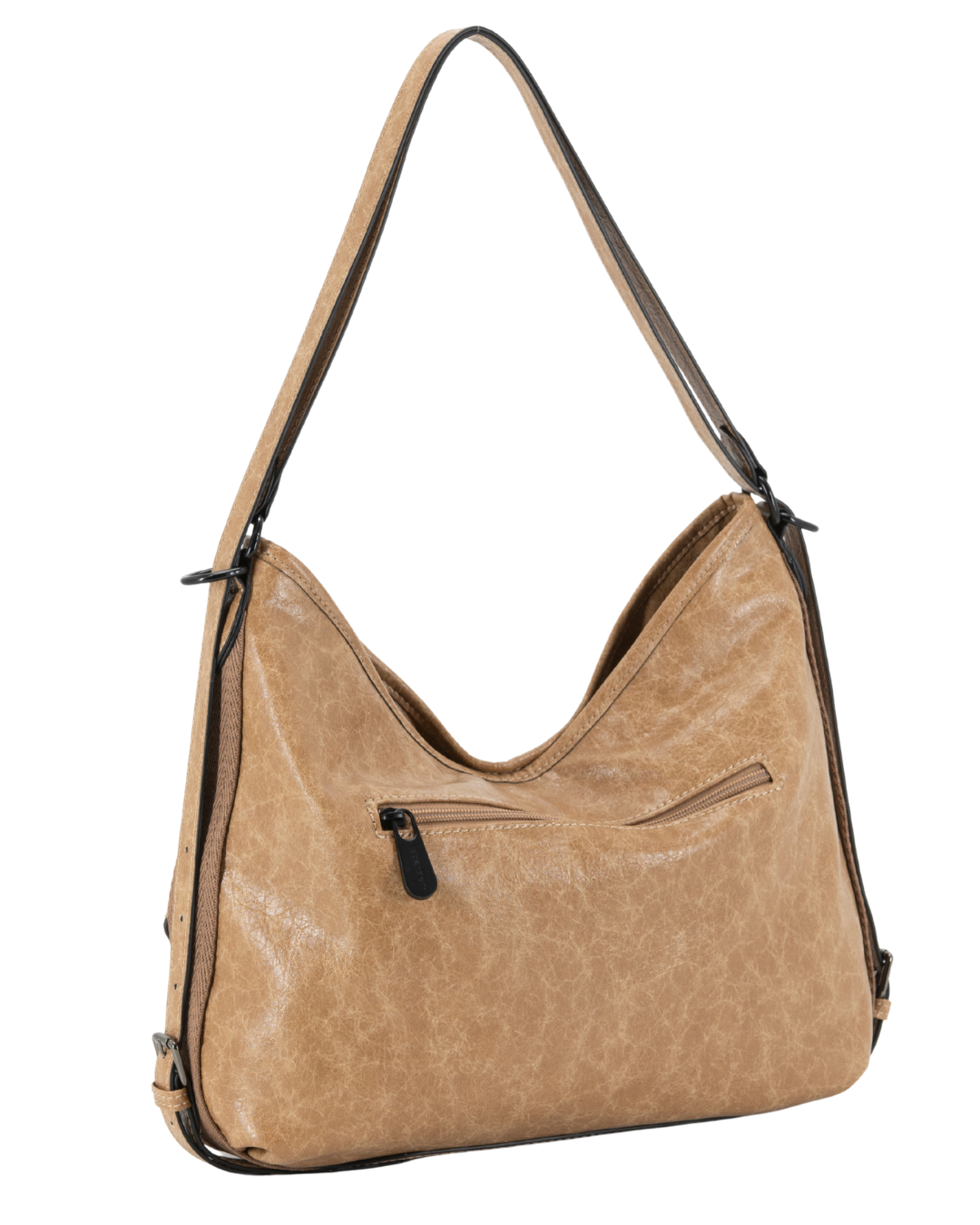 El bolso está confeccionado con material sintético simulando piel, material vegano. Varios compartimentos, bolsillo trasero. Cierre con cremallera. Tiradores personalizados y varios bolsillos interiores.