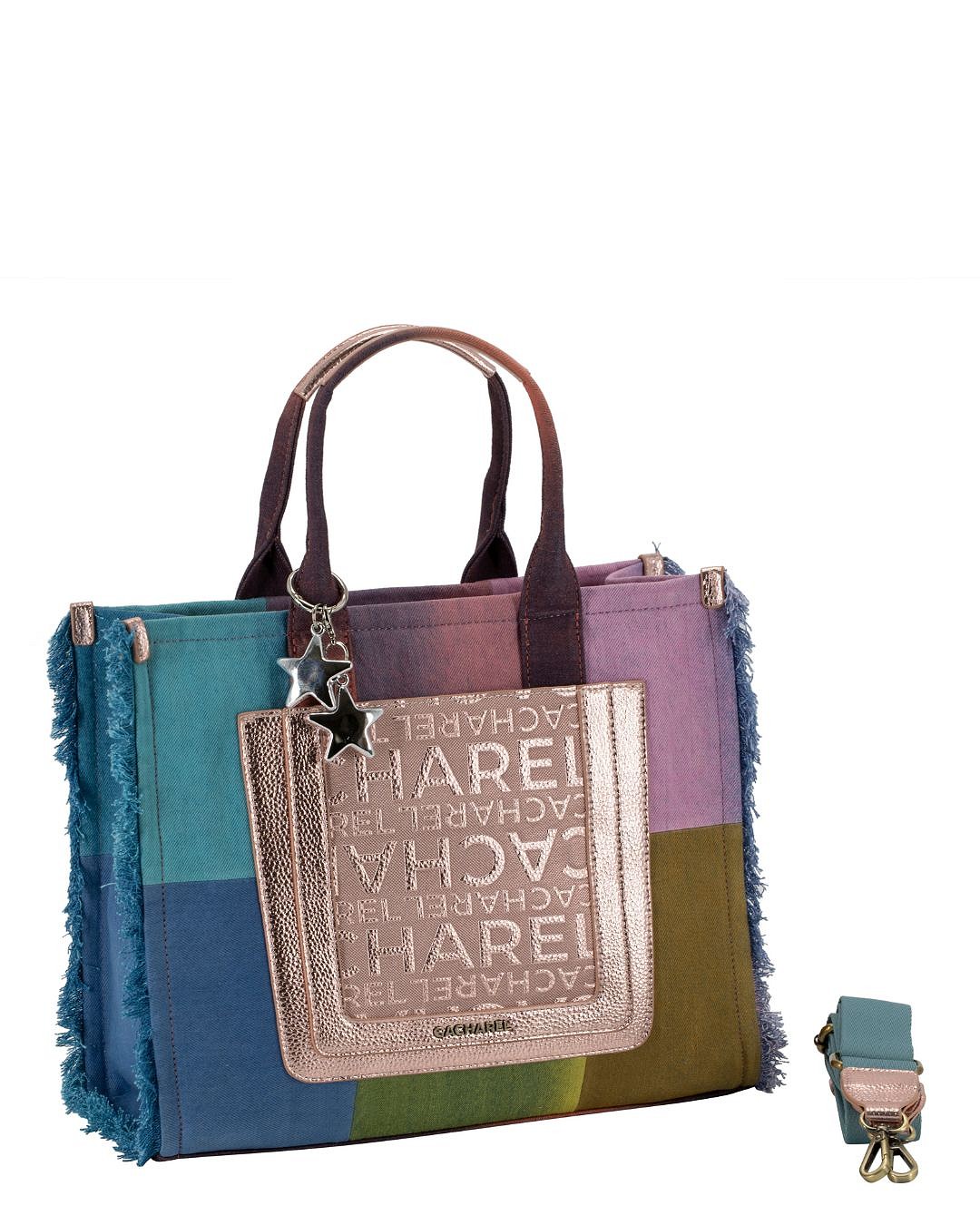 Cuenta con doble asa superior para llevar de mano y una asa bandolera desmontable y regulable, ideal para usarlo al hombro o cruzado según la ocasión. Como detalle especial, incluye un charm colgante de estrellas que suma personalidad y estilo. Los laterales con acabado desflecado refuerzan su estética casual y trendy, haciendo de este bolso una pieza versátil y protagonista para el día a día.