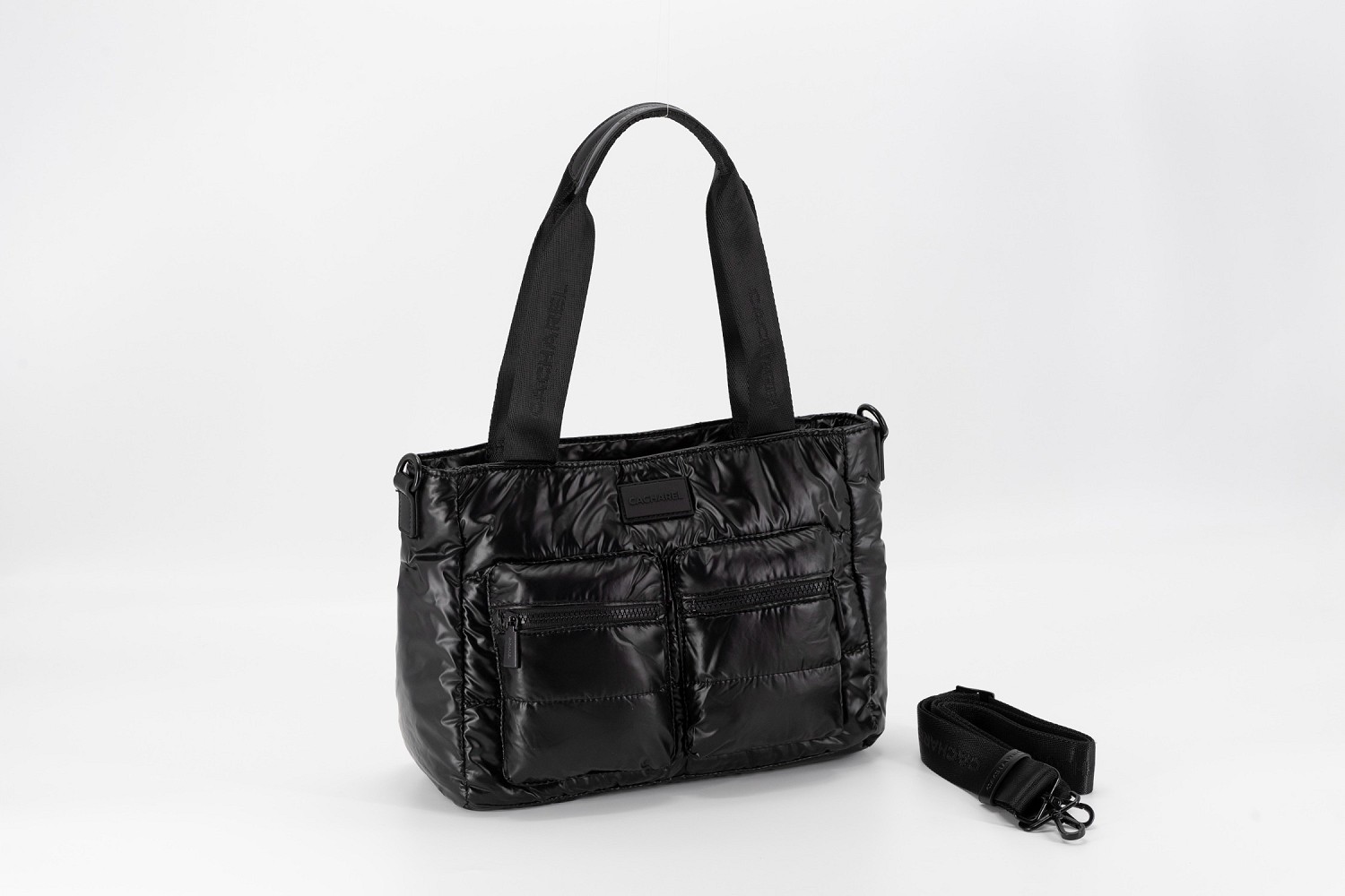 Bolso de nylon en color negro con el logotipo CACHAREL en goma. Dos bolsillos delanteros y uno trasero. Asa de hombro y asa regulable personalizadas con el nombre de la marca CACHAREL. Cierre con cremallera.