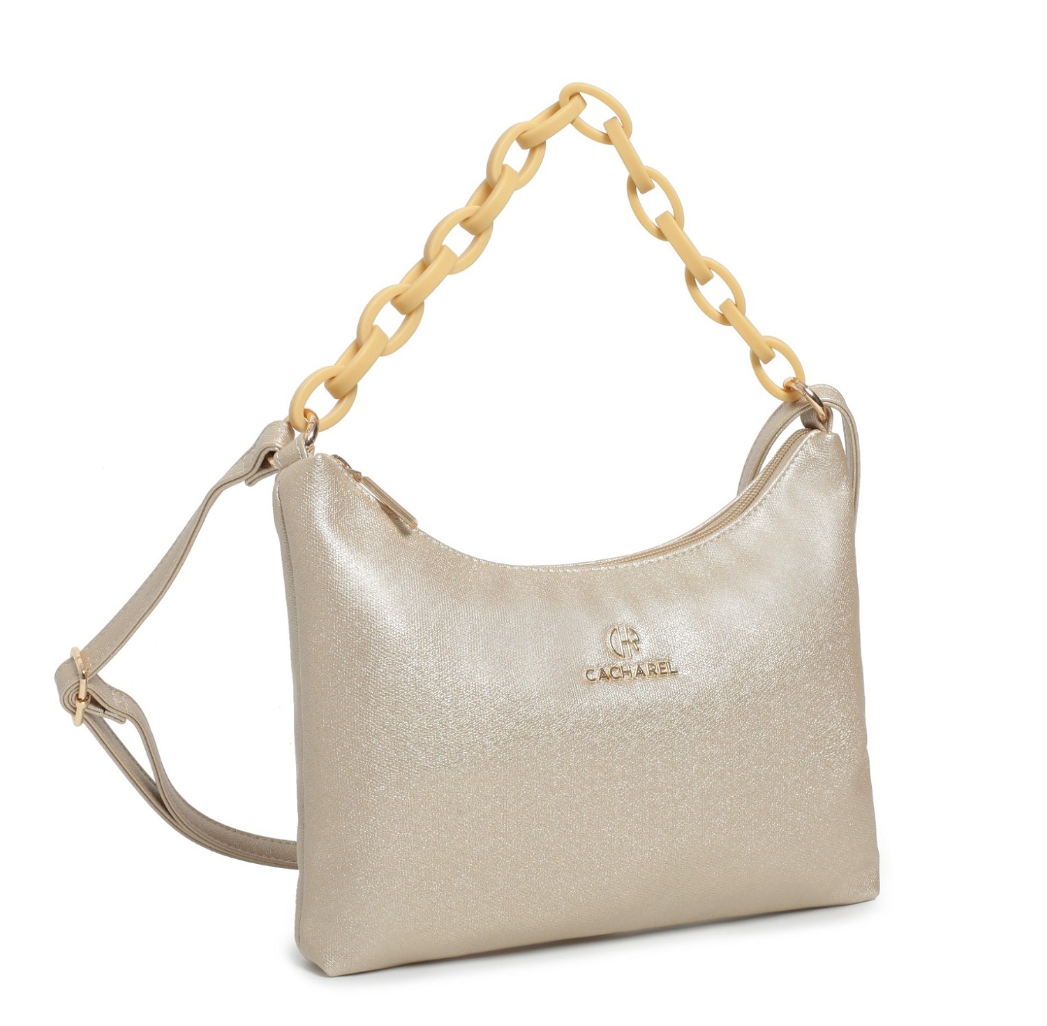 Bolso de fiesta en color oro, con un novedoso diseño combinado con cadena y asa bandolera.