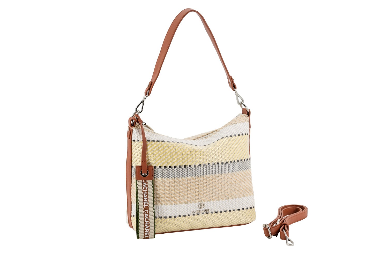 El bolso Marsella está elaborado con materiales novedosos en tonalidades beig, blanco y perla, trenzados entre sí. Cierre con cremallera, tiradores personalizados y varios bolsillos interiores. Exterior personalizado con logo metálico y charm CACHAREL. El asa se puede quitar gracias a los dos mosquetones personalizados y cambiar por un asa bandolera ajustable