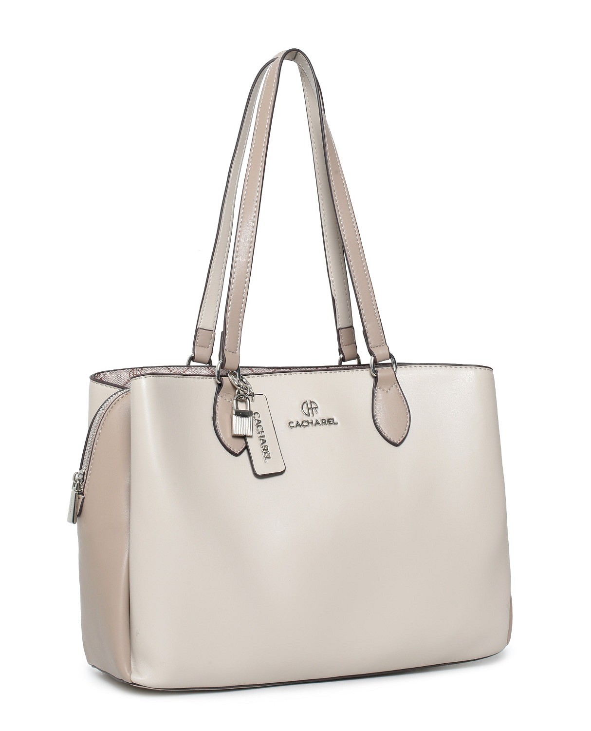 Bolso Maxi Shopper de vinilo con logotipo CACHAREL estampado en parte interior y combinado con material sintético efecto curtido. Charm en la base del asa. Tiene tres aperturas una de ellas con cierre en cremallera, bolsillo trasero con cremallera, tiradores personalizados y varios bolsillos interiores.