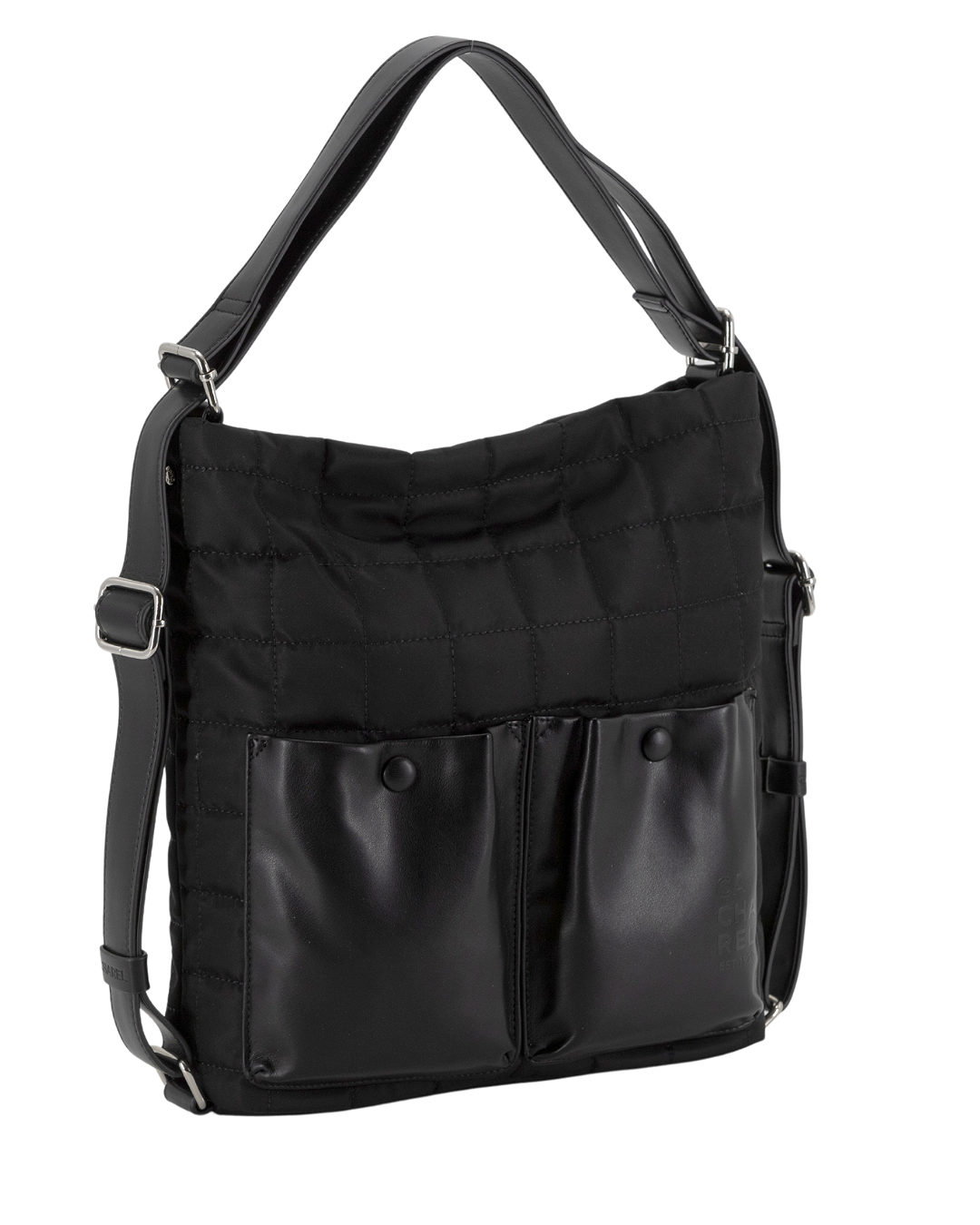 El bolso mochila confeccionada con material vegano y nylon. Cierre con cremallera, dos bolsillos delanteros y uno trasero. Varios bolsillos interiores.