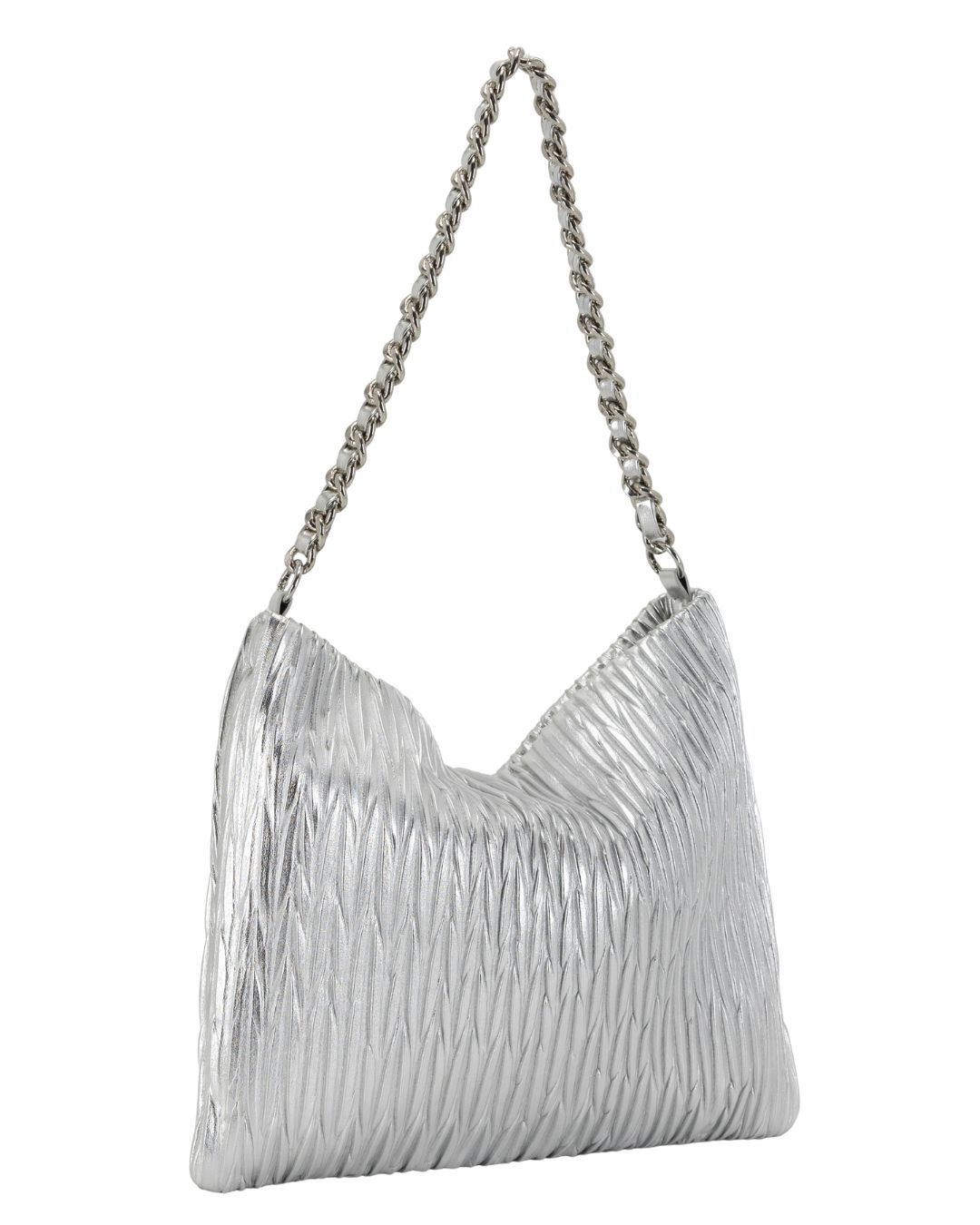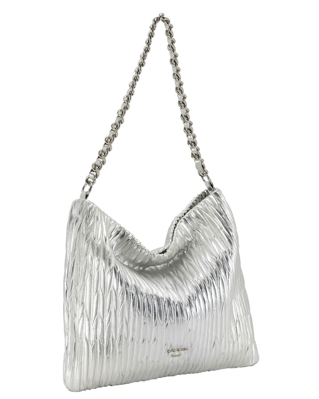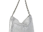 Bolso con novedoso plisado con asa de hombro combinada con cadena. Cierre con cremallera. Logo metálico en la parte delantera del bolso. Tiradores personalizados y varios bolsillos interiores.
