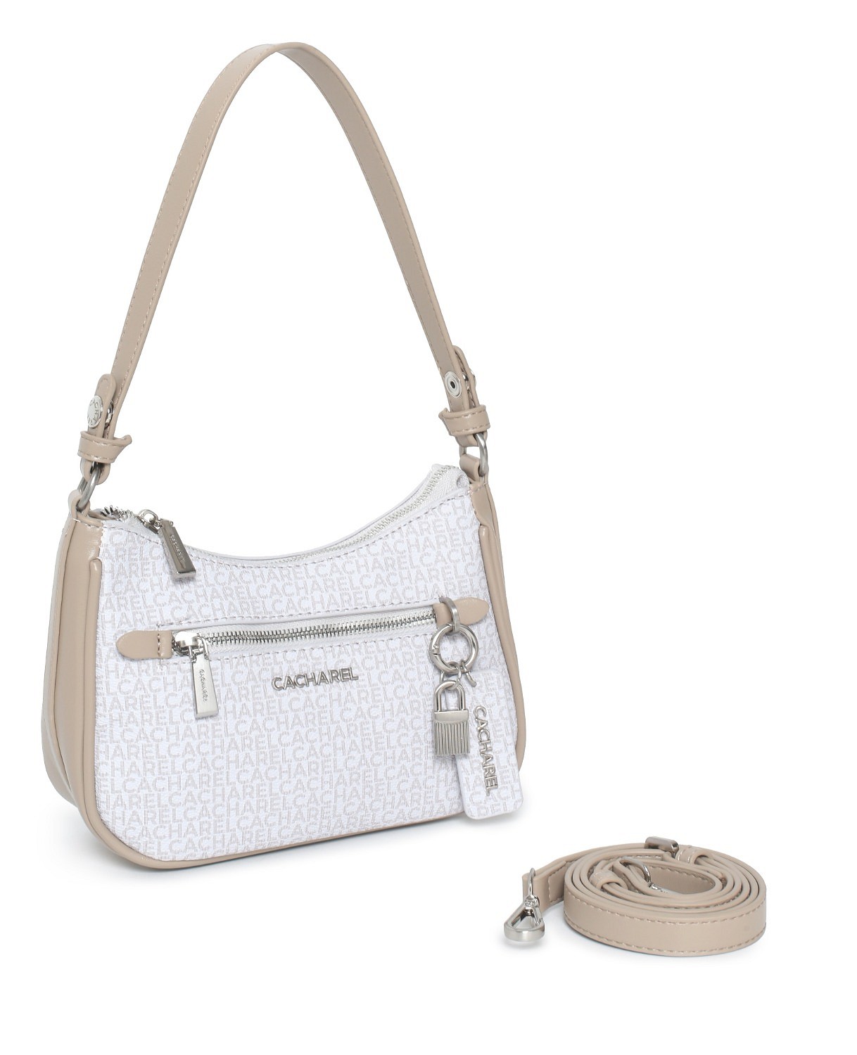 Bolso de tamaño medio de color beig y print en blanco. Cierre con cremallera y asa bandolera para sustituir al asa de hombro. Práctico y moderno, ideal para dar un toque chic a cualquier estilismo diario. Tiradores personalizados, varios bolsillos en el interior y exterior. La parte delantera y trasera está personalizada con el nuevo print y charm del monograma.