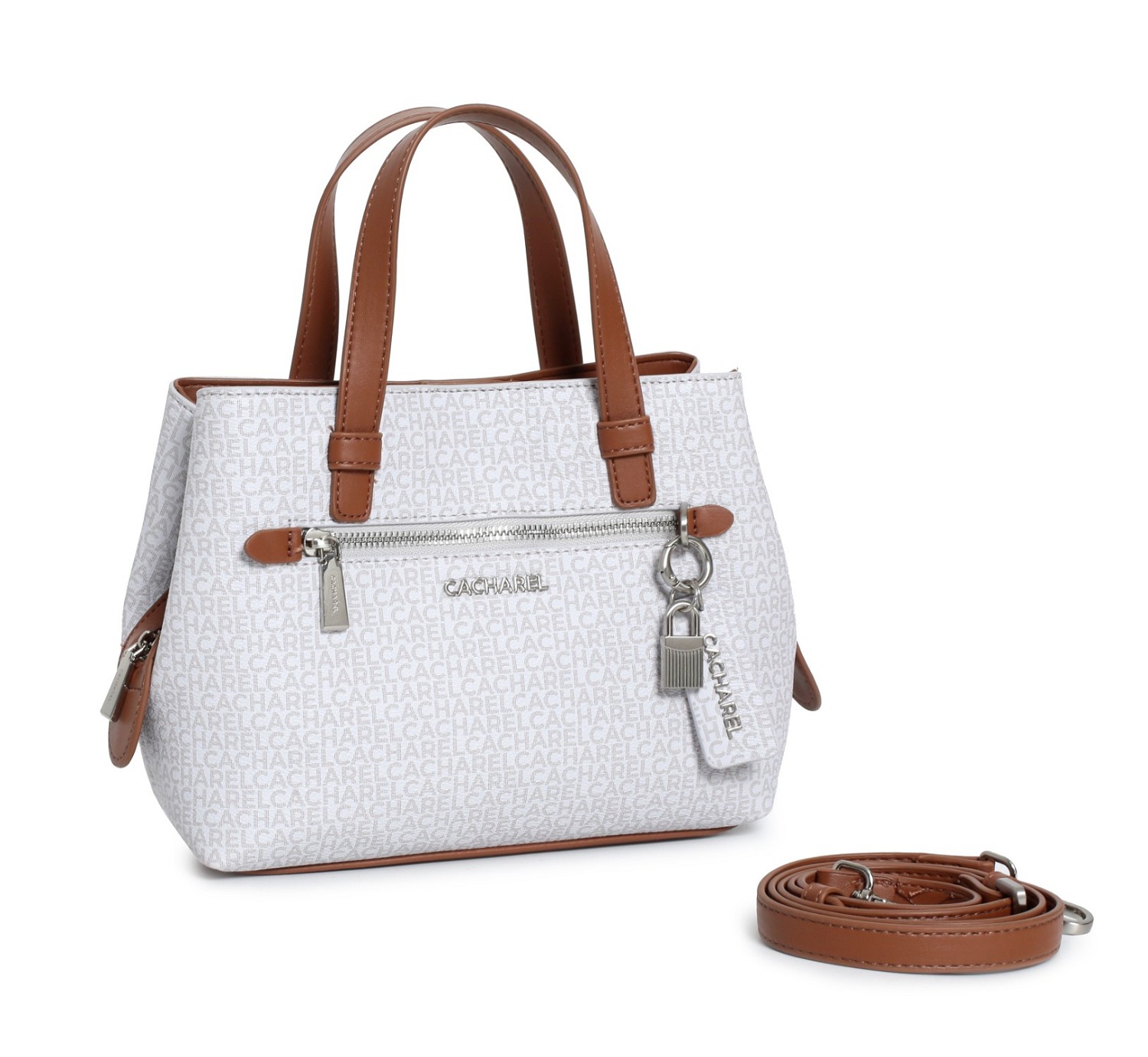 Bolso de tamaño medio de color blanco y cuero con tres compartimentos. El compartimento central con cremallera, práctico y moderno, ideal para dar un toque chic a cualquier estilismo diario. Tiradores personalizados, varios bolsillos en el interior y exterior. Asa larga para llevarlo de bandolera. La parte delantera y trasera está personalizada con el nuevo print y charm del monograma.