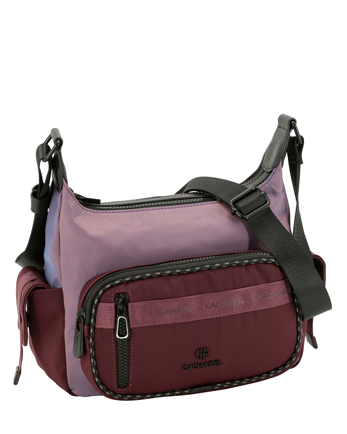 Bolso bandolera doble compartimento de tamaño mediano, cierre de cremallera, bolsillo delantero, trasero y en ambos lados. Exterior personalizado con logo metálico en color negro, combinado con asas y cremalleras.