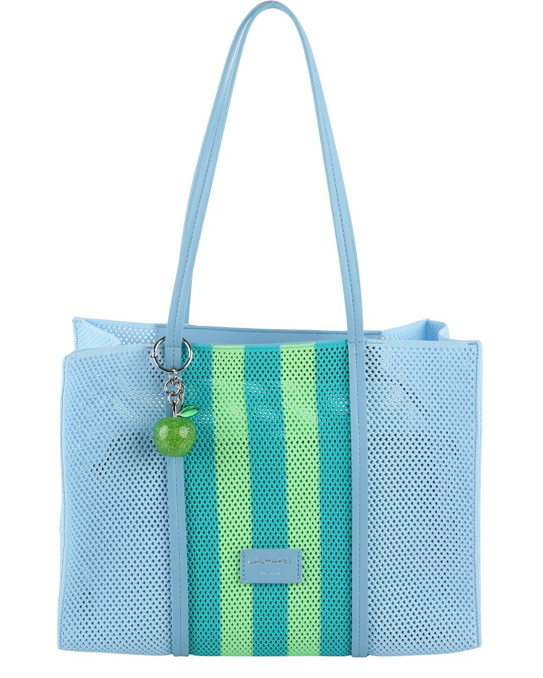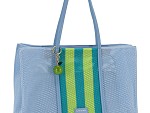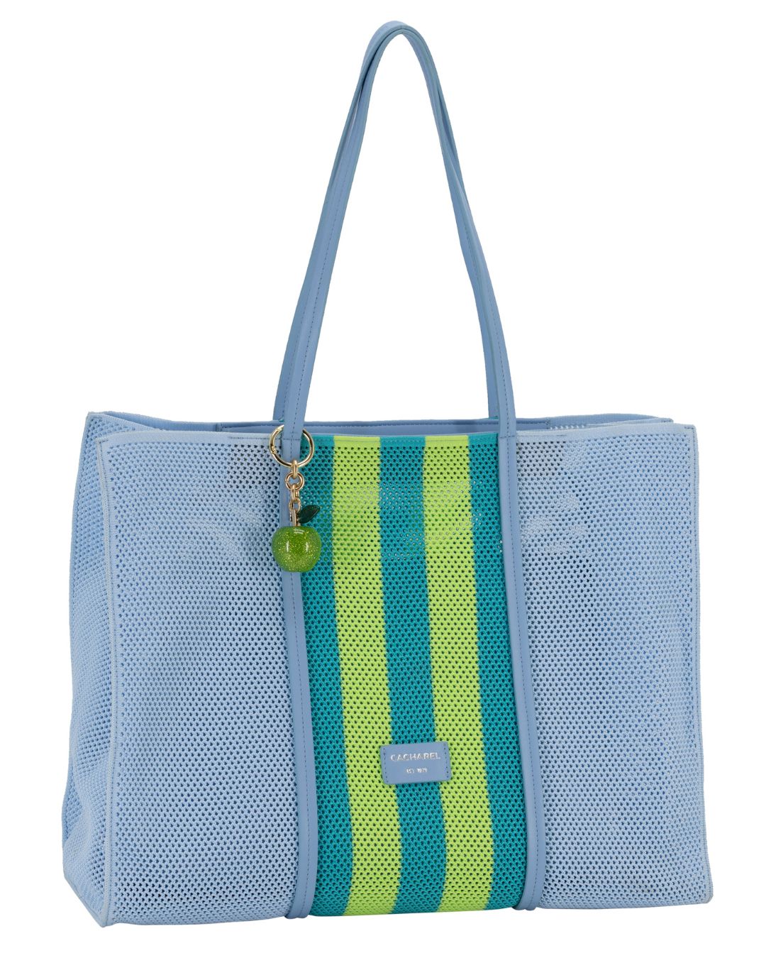 Está confeccionado en material de goma con efecto red, ligero y resistente, en tono beige natural combinado con rayas verticales, que aportan un aire dinámico y muy veraniego. Su formato amplio permite llevar cómodamente todo lo necesario durante el día.