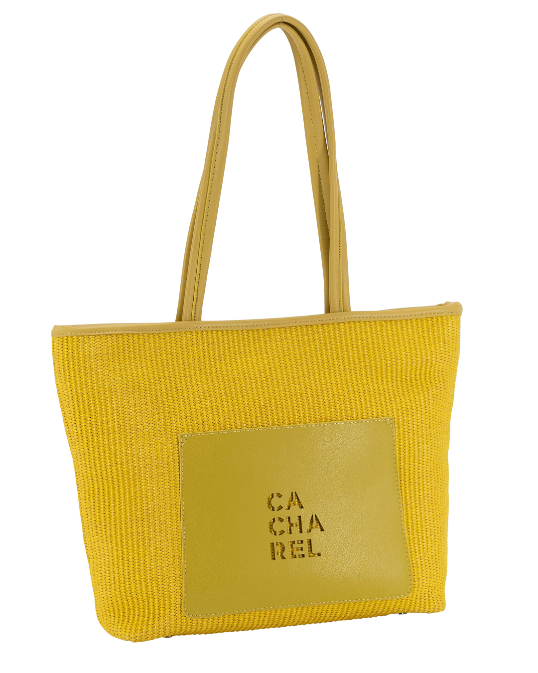 Bolso Shopper de la elaborado con materiales efecto rafia. Cierre en cremallera y bolsillo interior. Exterior personalizado con un bolsillo en contraste con logo CACHAREL grabado.