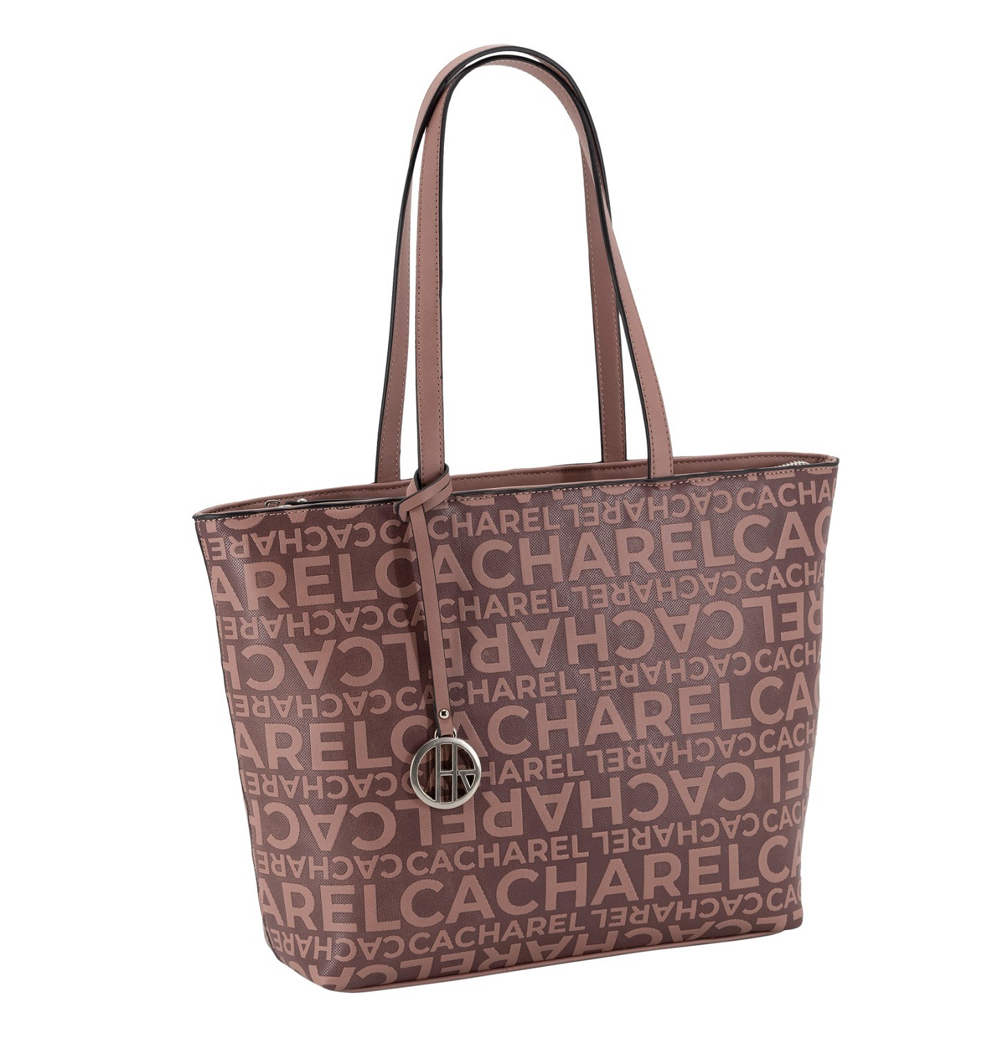 Espacioso bolso shopper confeccionado en material sintético con grabado CACHAREL. Acabado exquisito y charm metálico.
