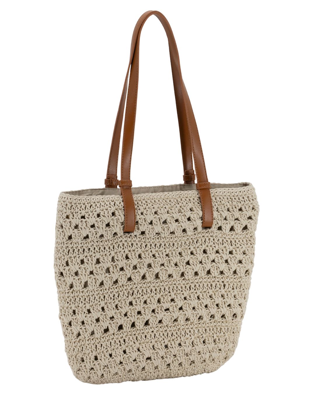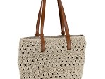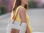 Este bolso tipo tote destaca por su estilo natural y artesanal, confeccionado en ganchillo con un entramado calado que aporta ligereza y un aire veraniego muy actual. Su tono beige neutro lo convierte en un complemento versátil y fácil de combinar con looks casuales y relajados.