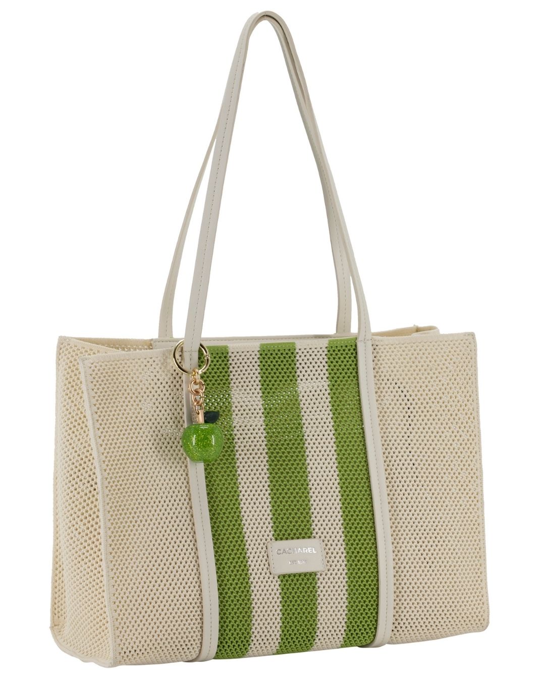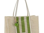 Está confeccionado en material de goma con efecto red, ligero y resistente, en tono beige natural combinado con rayas verticales en verde, que aportan un aire dinámico y muy veraniego. Su formato amplio permite llevar cómodamente todo lo necesario durante el día.