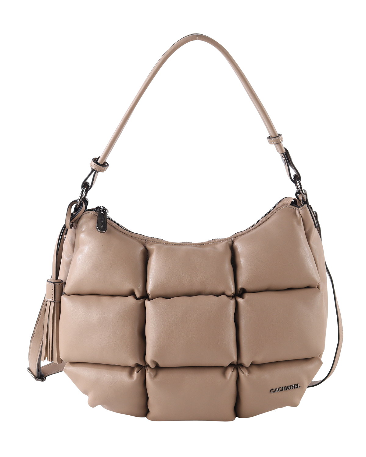 Shopper con novedoso acolchado. Cierre con cremallera. Logo metálico en la parte delantera del bolso. Tiradores personalizados y varios bolsillos interiores. Charm.