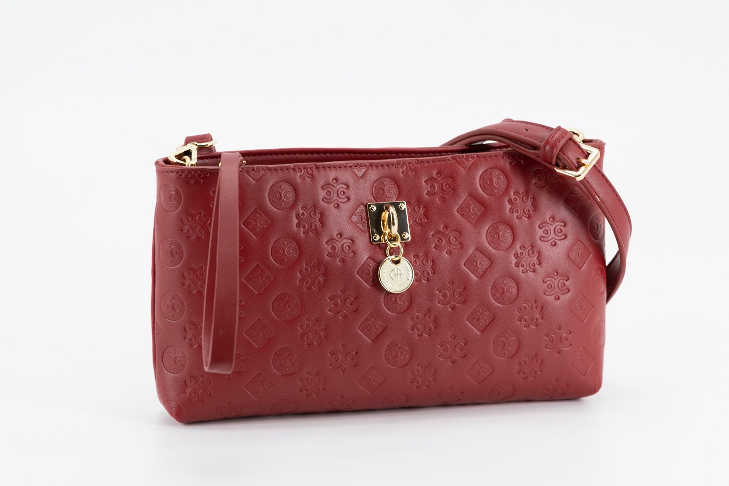 Cartera con grabado de logos CACHAREL en color carmín. Bolsillo exterior trasero y cierre de cremallera. Asa bandolera y asa de mano con mosquetones para poderse quitar. Exterior personalizado con logo metálico grabado dentro de una medalla colgante.