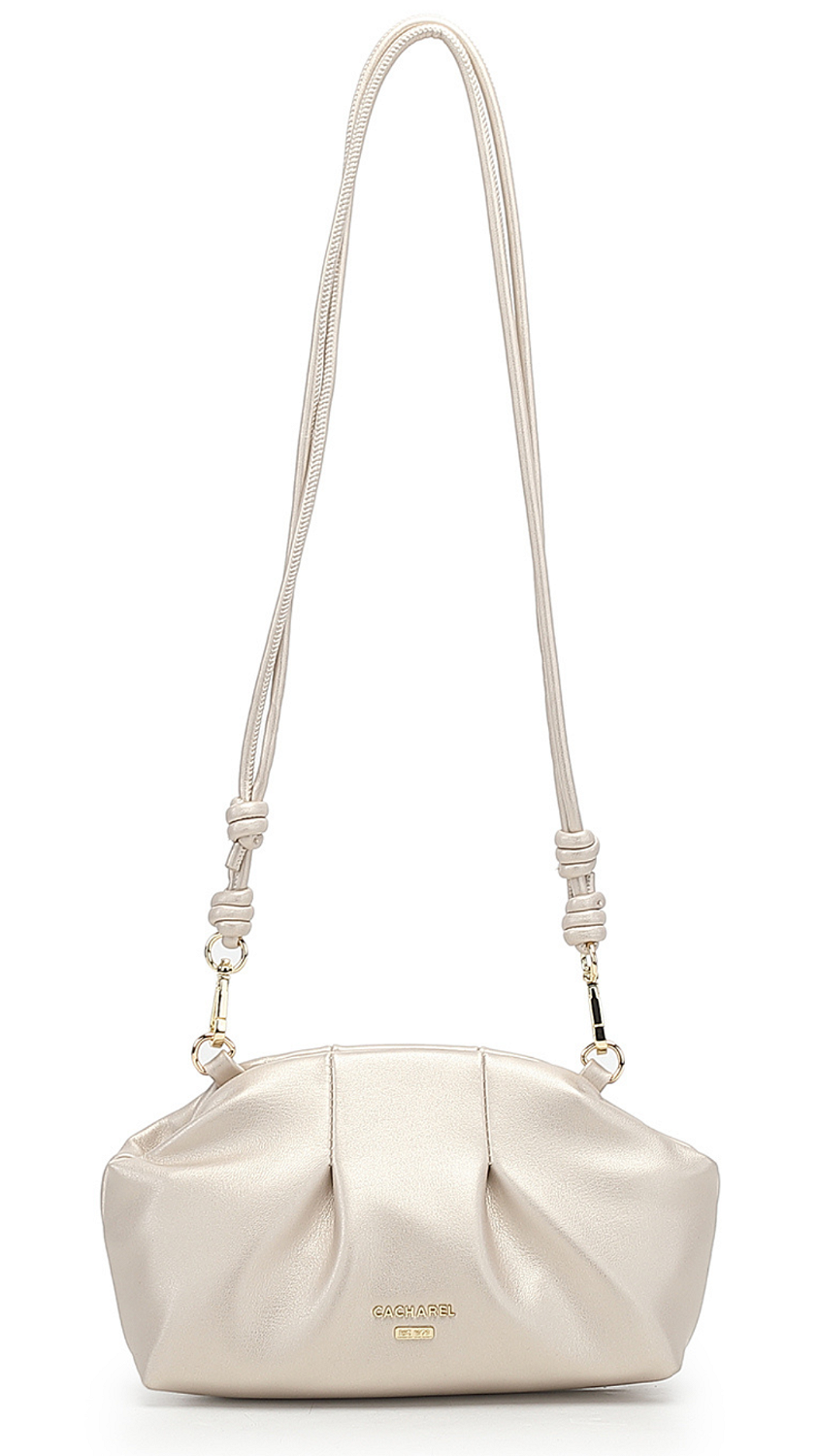 Clutch Cacharel con asa regulable, cierre con boquilla y detalles nudos. Material vegano con tacto suave. Logo metálico en la parte delantera del bolso.