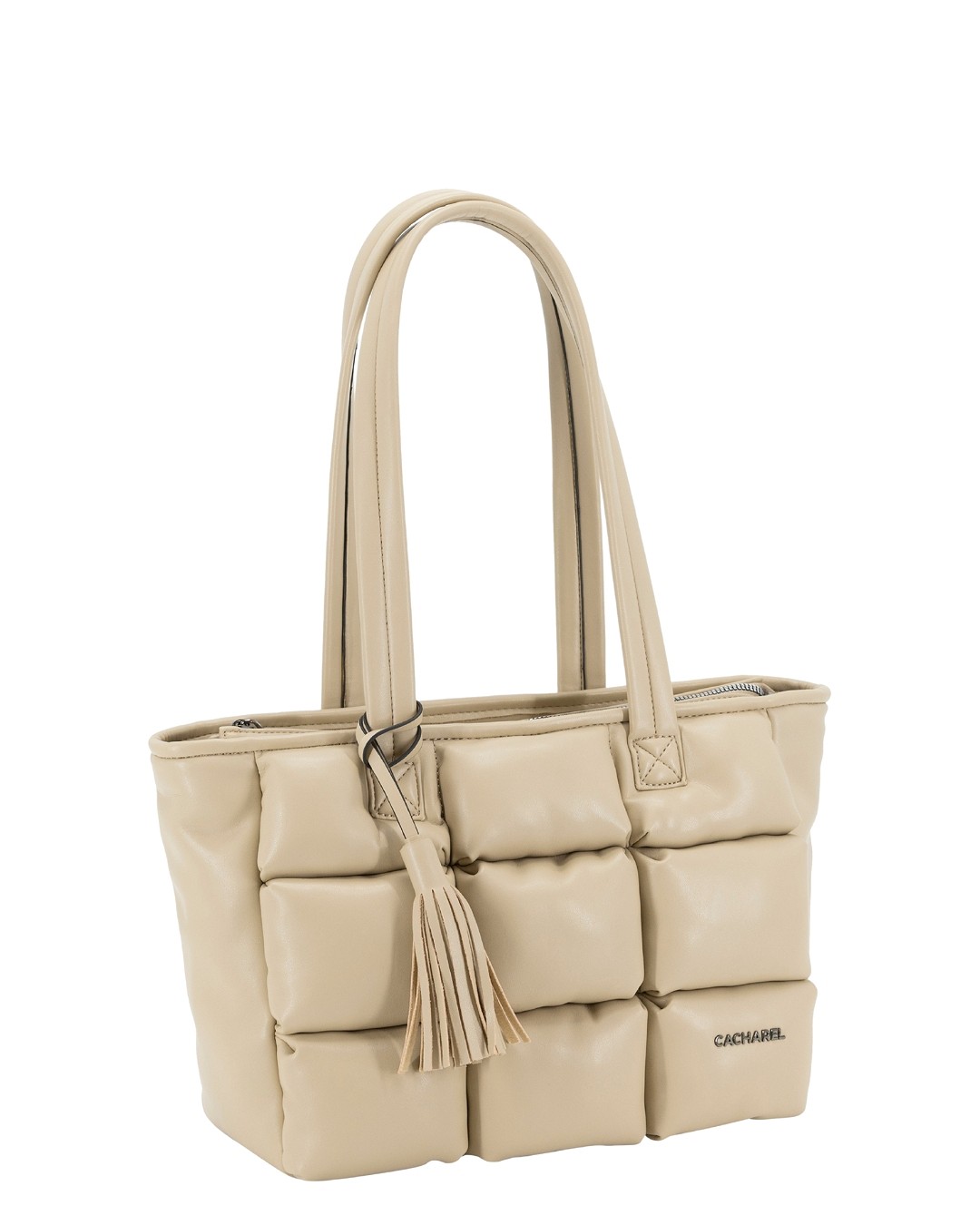 Shopper con novedoso acolchado. Cierre con cremallera. Logo metálico en la parte delantera del bolso. Tiradores personalizados y varios bolsillos interiores. Charm.