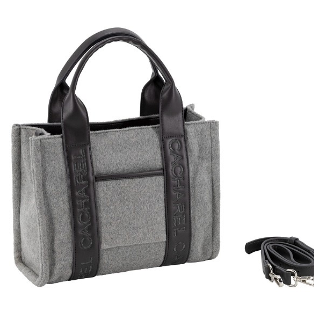 Mini shopper tamaño mediano fabricado en fieltro con logotipo CACHAREL bordado en ambas asas, combinado con material sintético al tono. Tiradores personalizados y varios bolsillos en el interior. Asa bandolera.