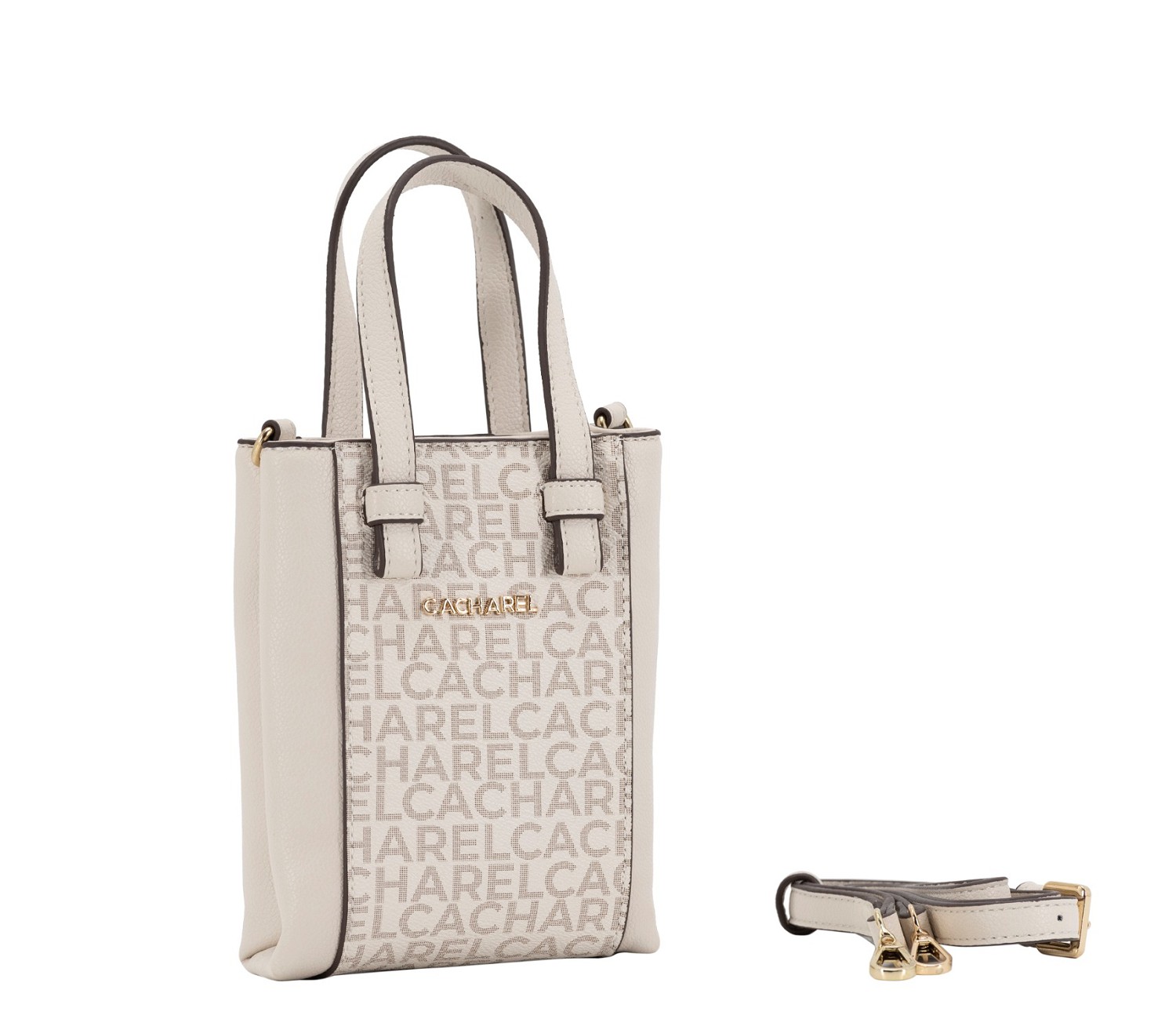 Estampado logotipo CACHAREL combinado con polipiel en blanco roto. Este modelo cuenta con una correa larga ajustable, además de las asas de mano.